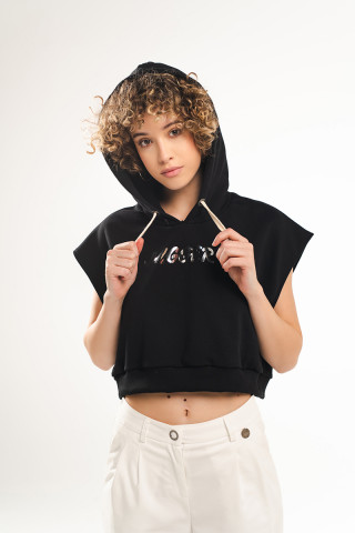 Opis: Pamučni kratki ženski prsluk u crnoj boji sa kapuljačom i logo printom u metalik siivoj boji