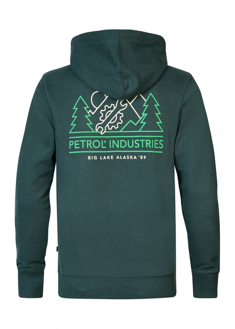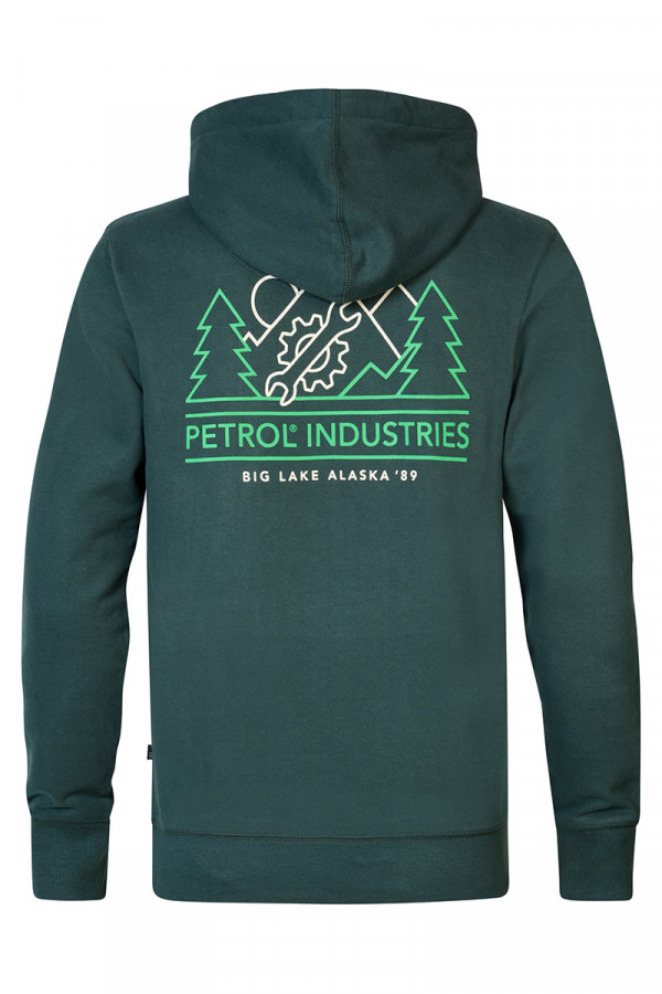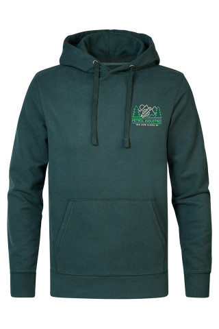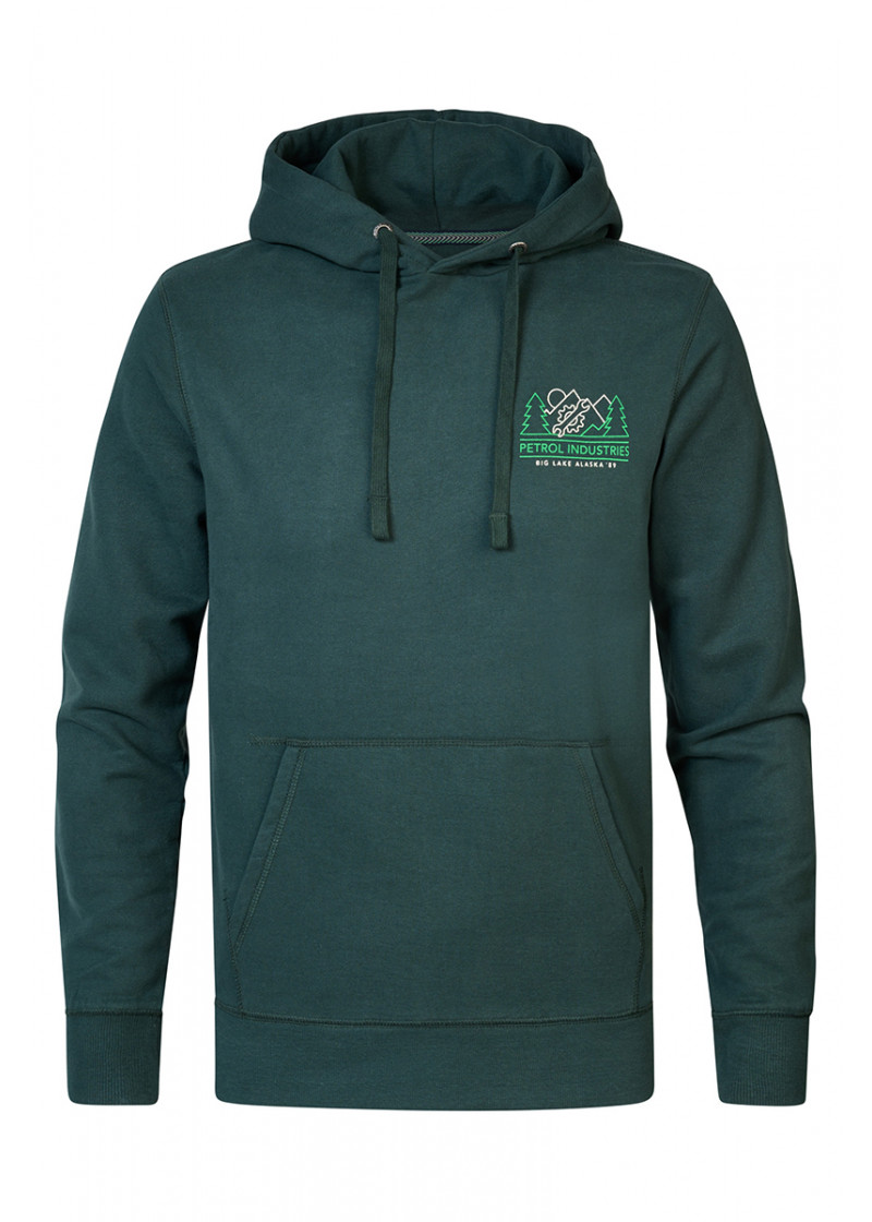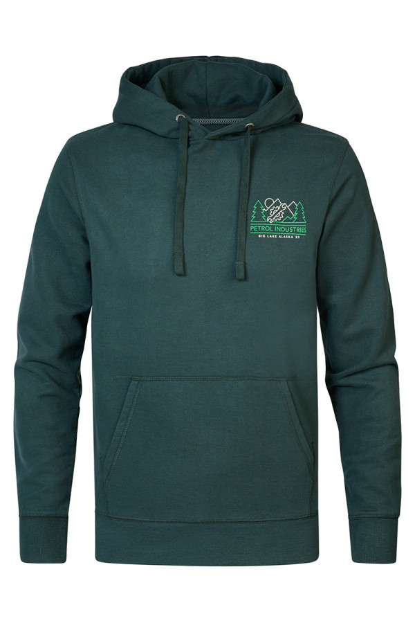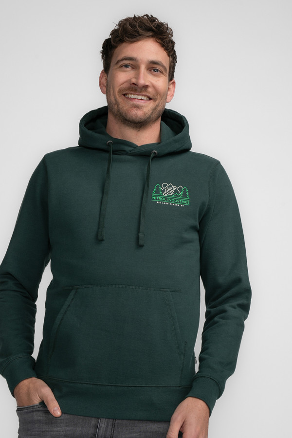 Opis: Muški duks u petrolej zelenoj boji sa kapuljačom, kengur džepom i printom