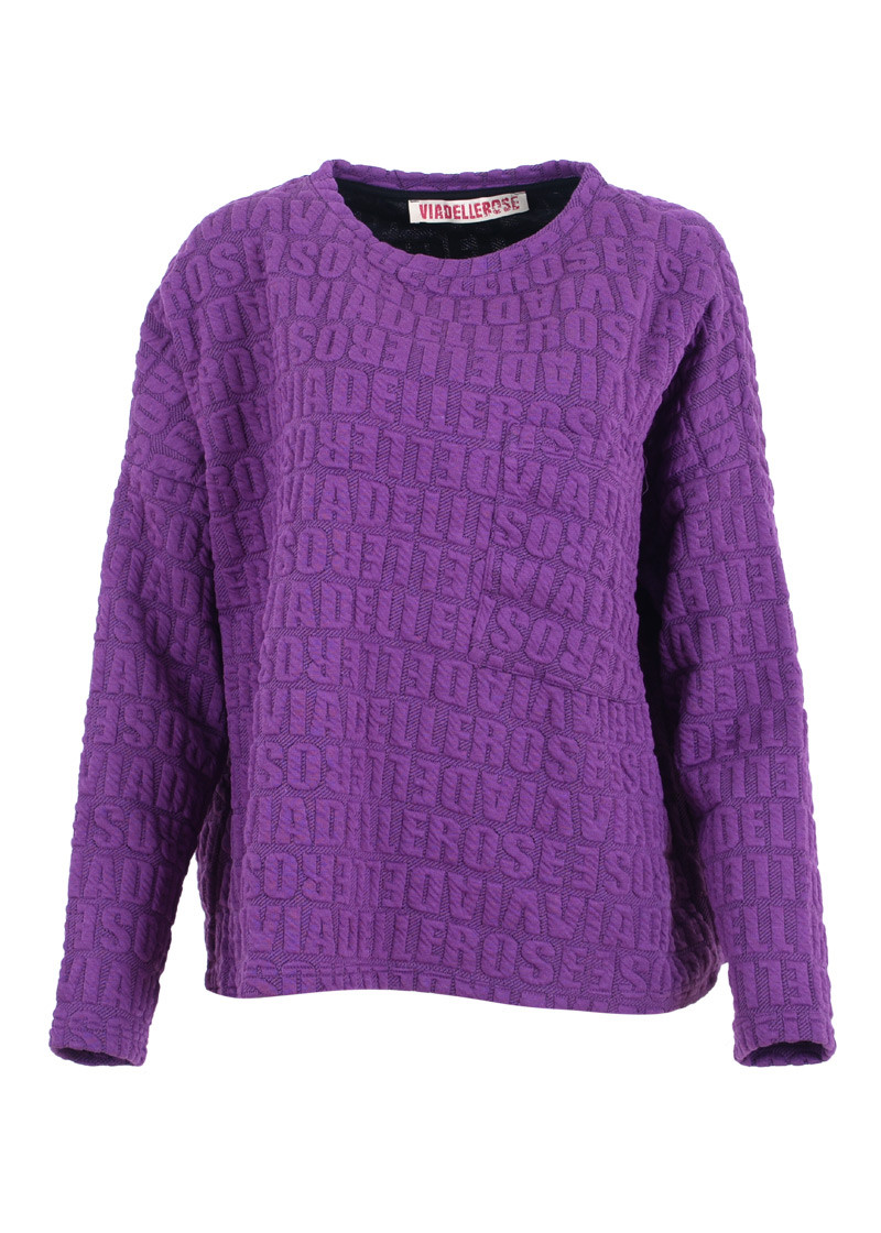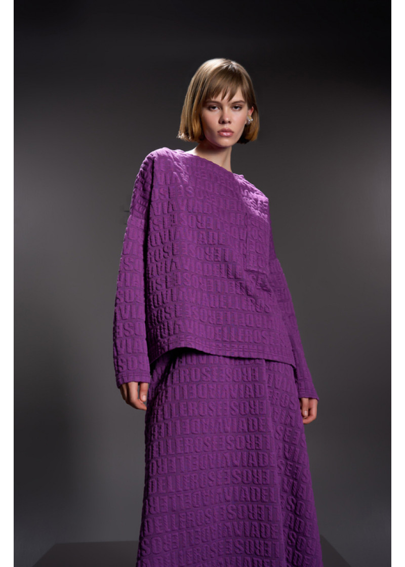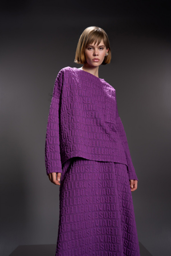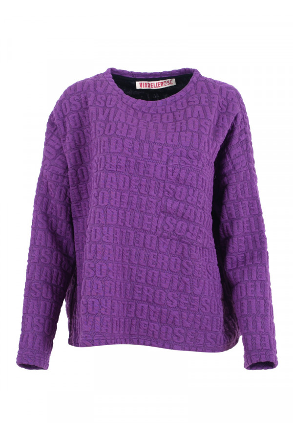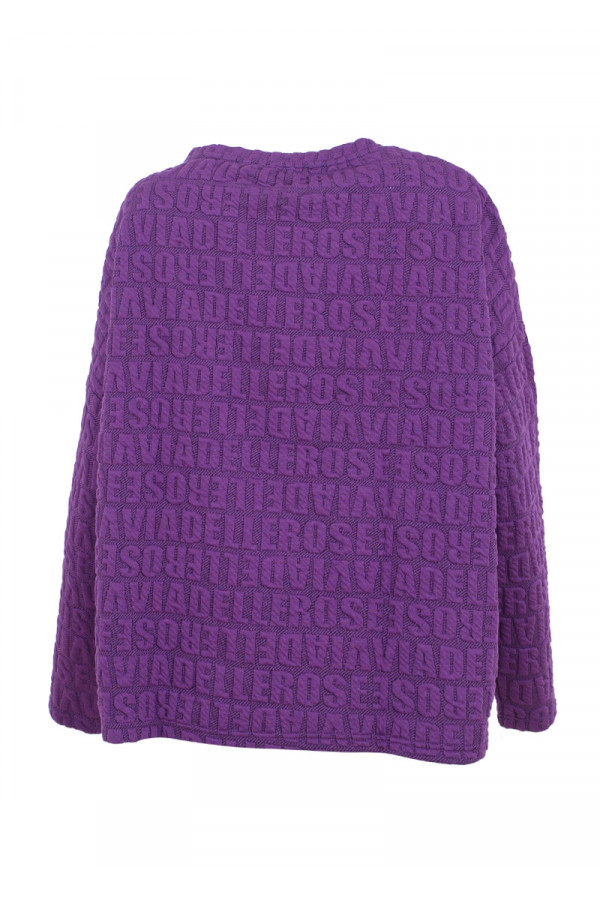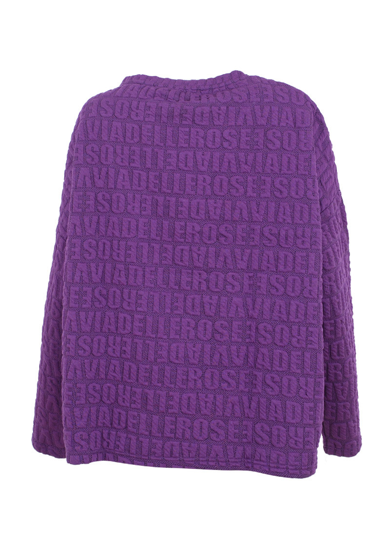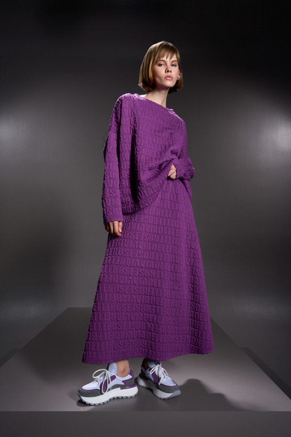 Opis: Ženski duks u ljubičastoj boji sa dugim rukavima, spuštenim naramenicama i all-over logo printom