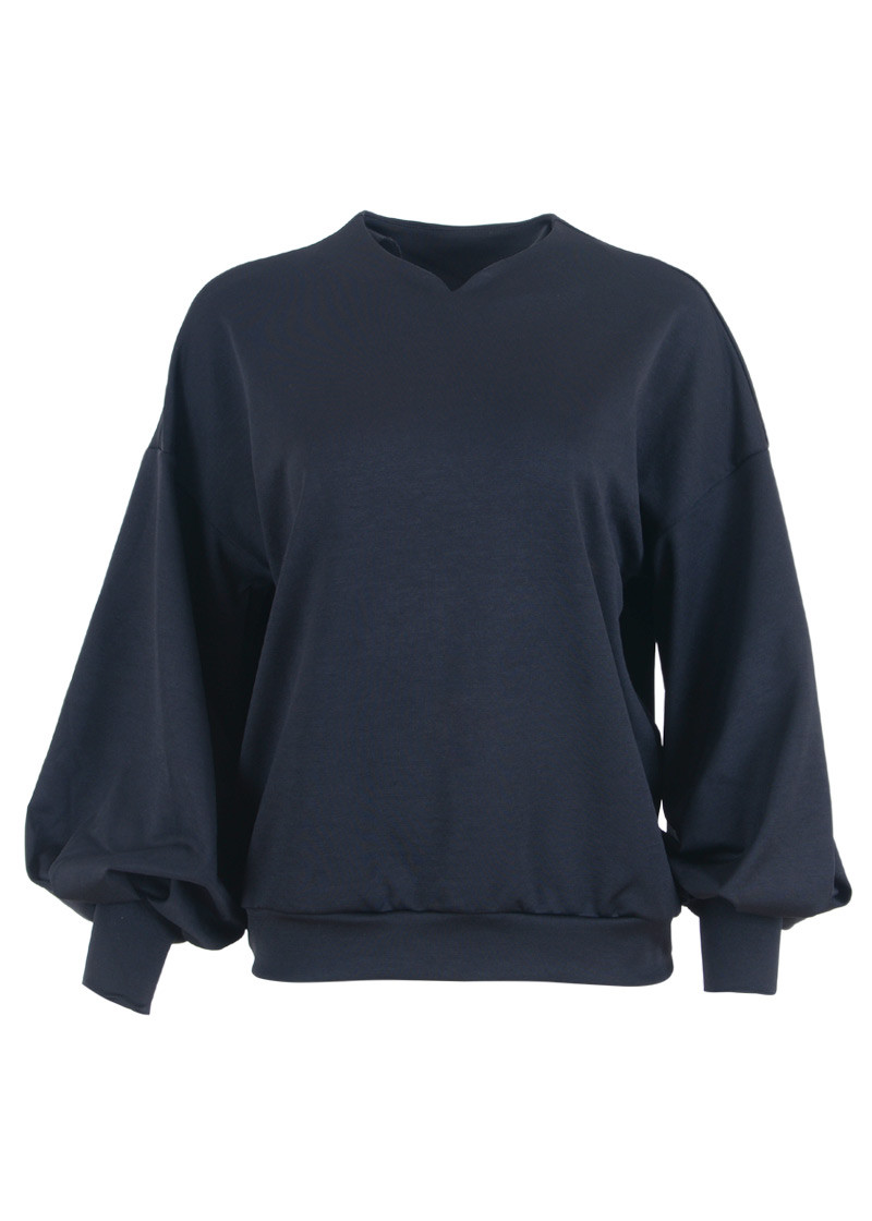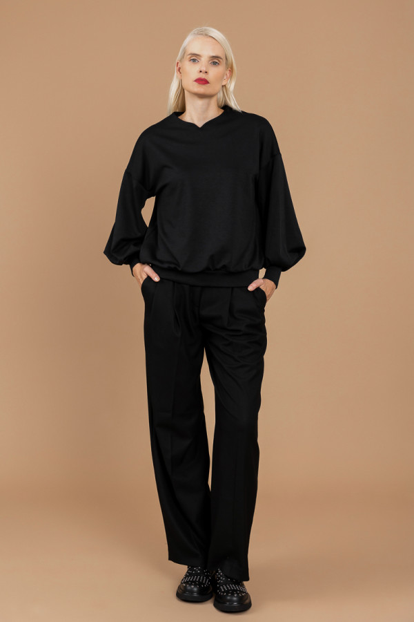 Opis: Ženski duks u crnoj boji sa V-e izrezom i balon rukavima