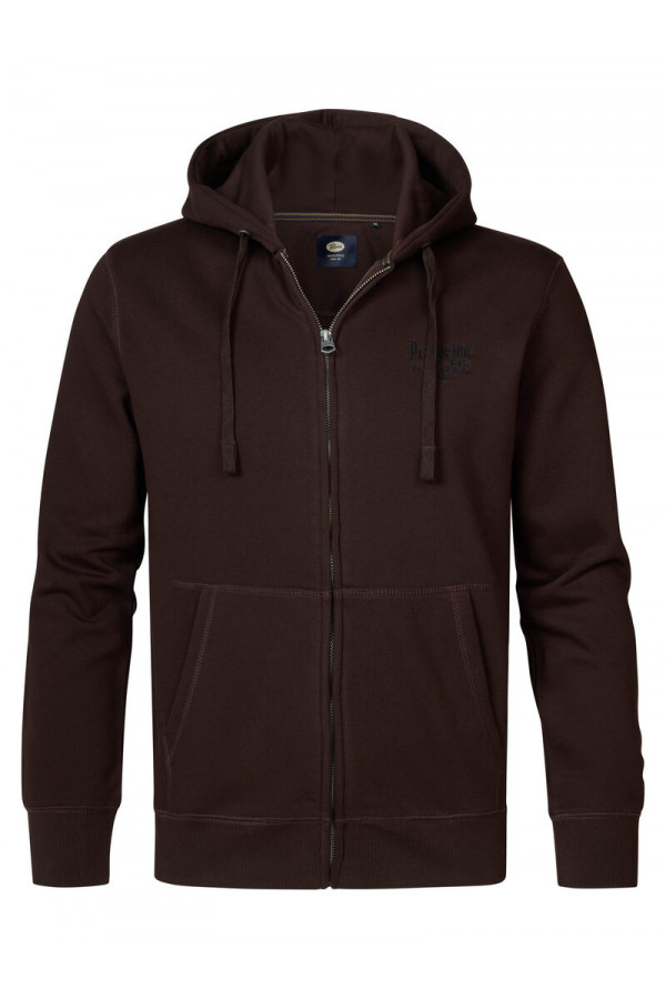 Opis: Muški duk u tamno braon boji sa zipom kapuljačom i kengur džepom