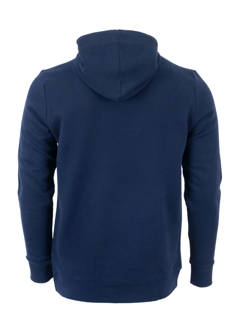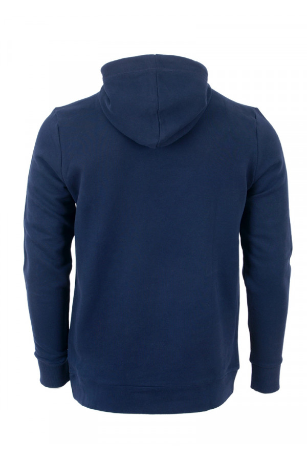 Opis: Pamučni muški duks u teget boji u teget boji sa kapuljačom, kengur džepom i printom