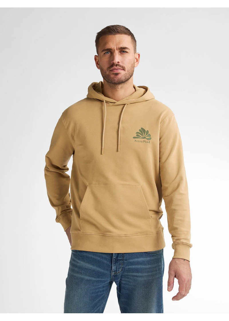 Opis: Pamučni muški duks u kapućino boji sa kengur džepom, kapuljačom i printom