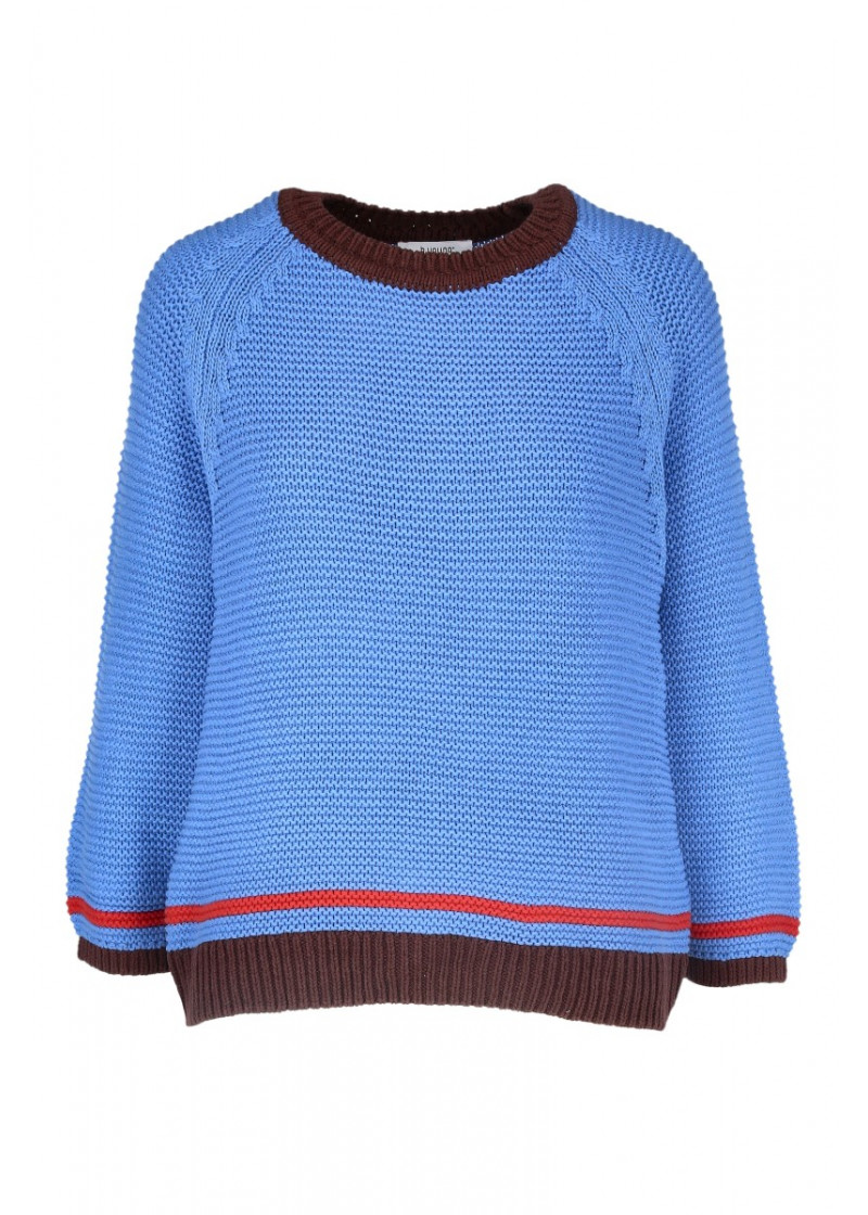 Opis: Ženski džemper dugih rukava u baby plavoj boji sa prugama