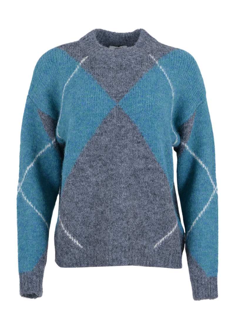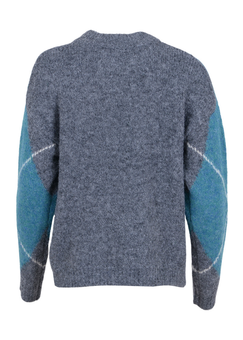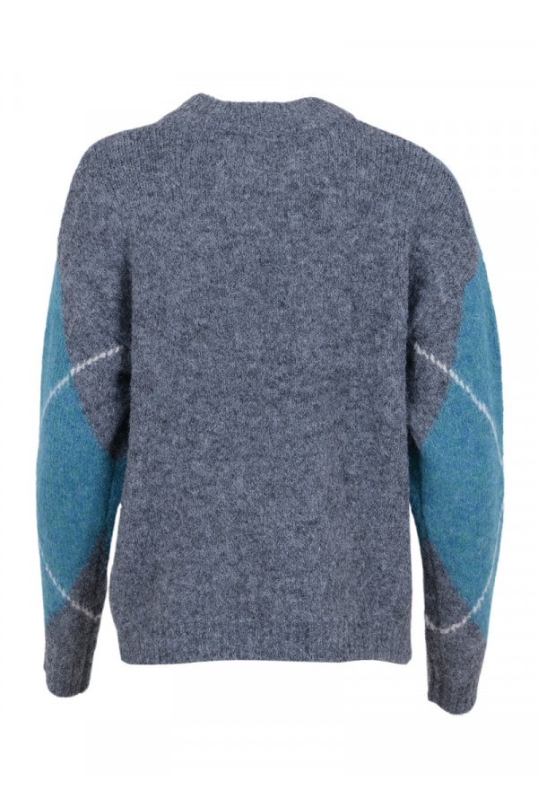 Opis: Ženski džemper u geometrijskom dezenu sive i plave boje sa okruglim izrezom oko vrata