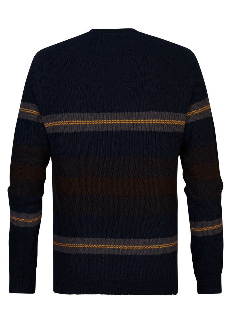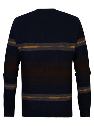Opis: Pamučni muški džemper u tamno tegete boji sa prugastim detaljima i okruglim izrezom oko vrata