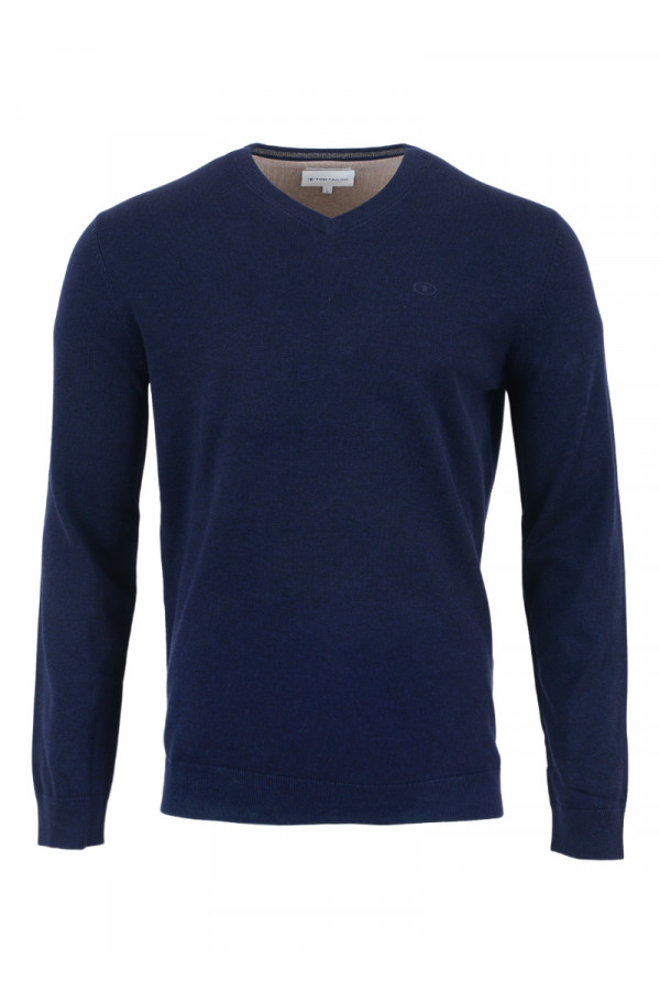 Opis: Pamučni muški chino fit džemper u teget boji sa V-e izrezom i dodatkom održivog pamuka