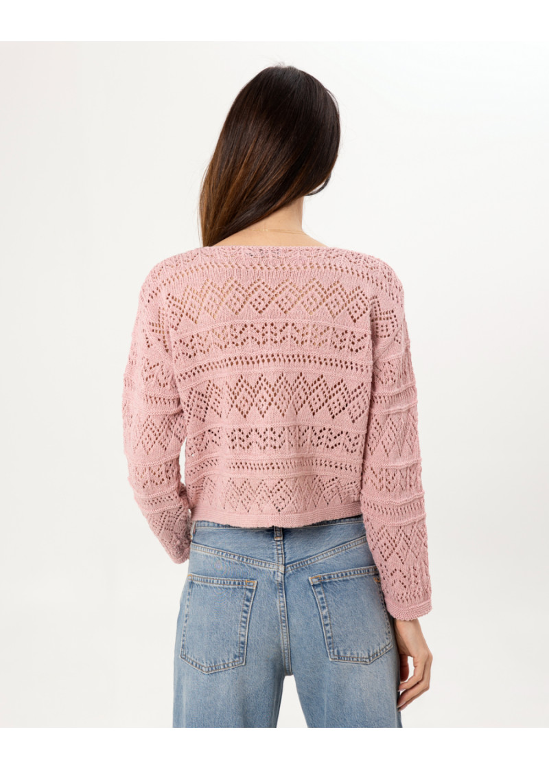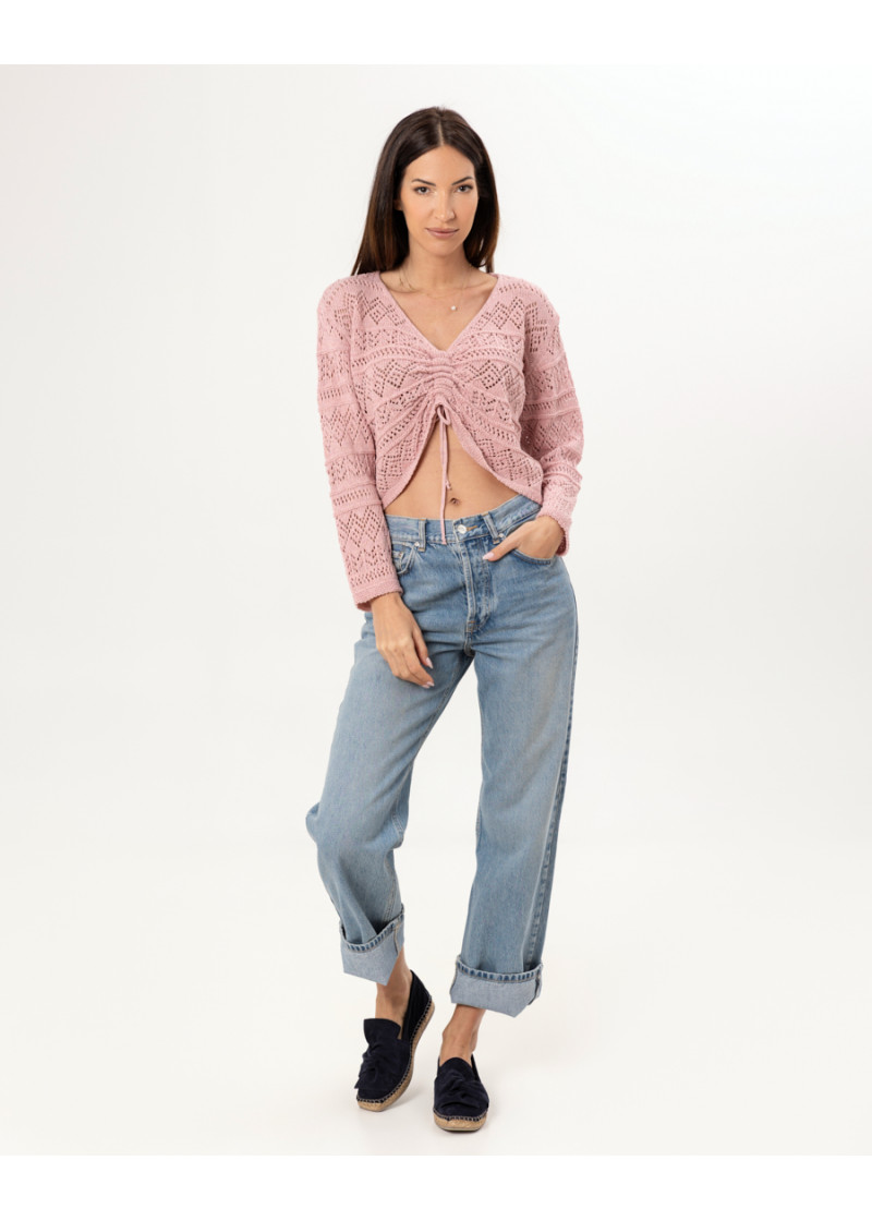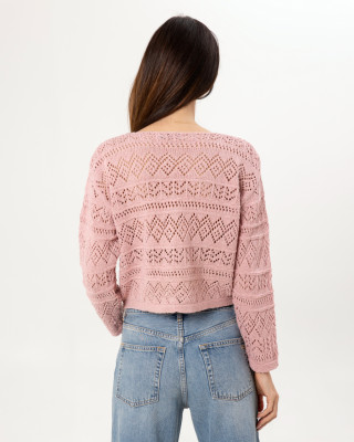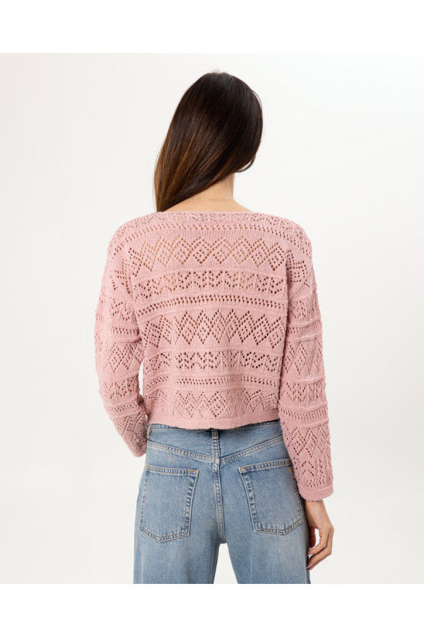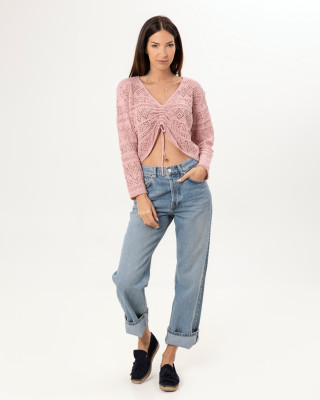 Opis: Kratak ženski džemper u bledo roza boji sa rupičastim radom i podesivim učkurom