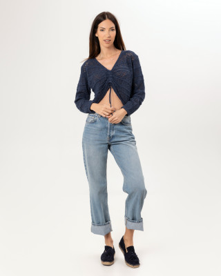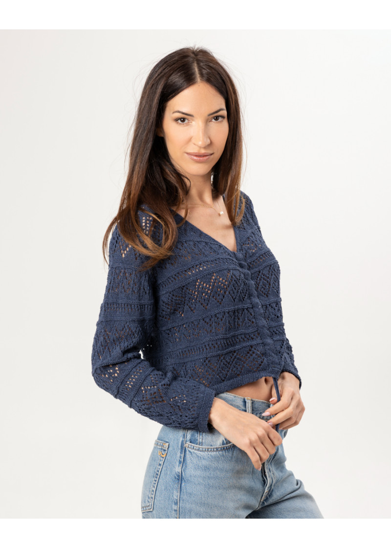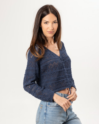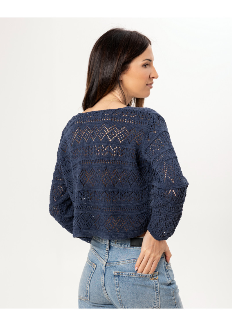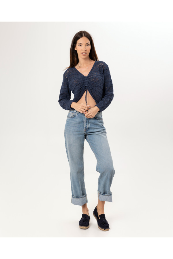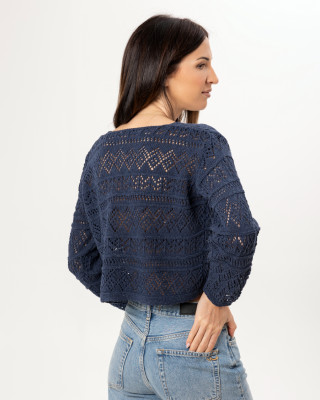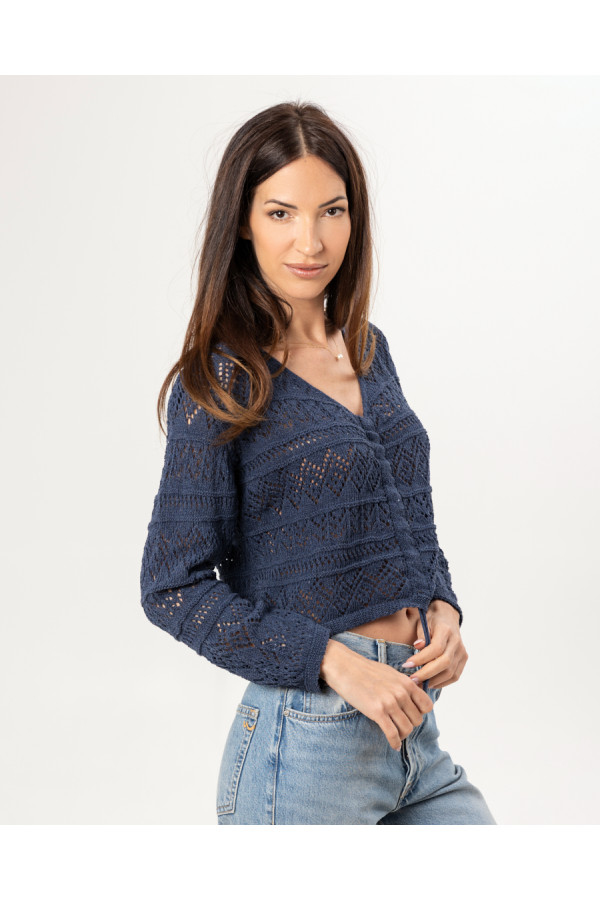 Opis: Kratak ženski džemper u teget boji sa rupičastim radom i podesivim učkurom