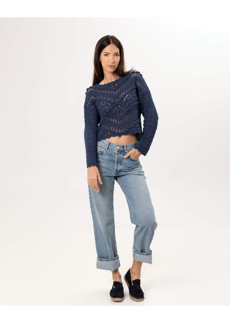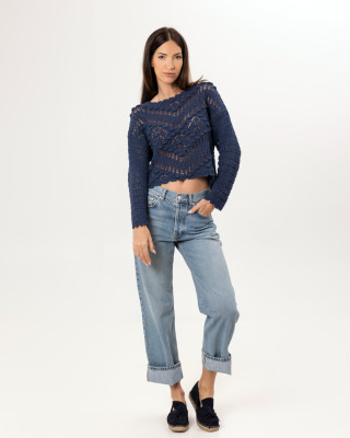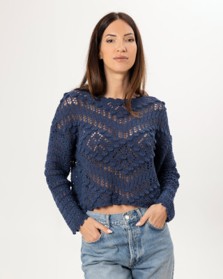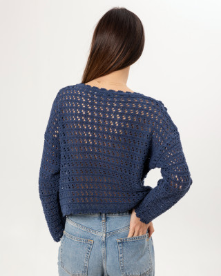 Opis: Kratak ženski džemper sa rupičastim radom u teget boji