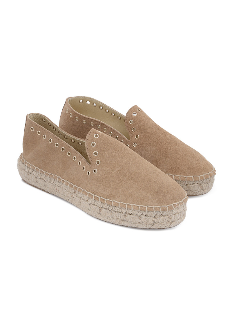 Opis: Ženske espadrile od prevrnute kože u bež boji sa ravnom paltformom i ringlicama