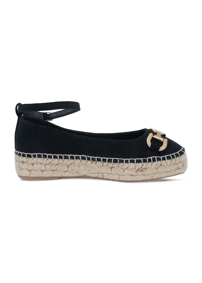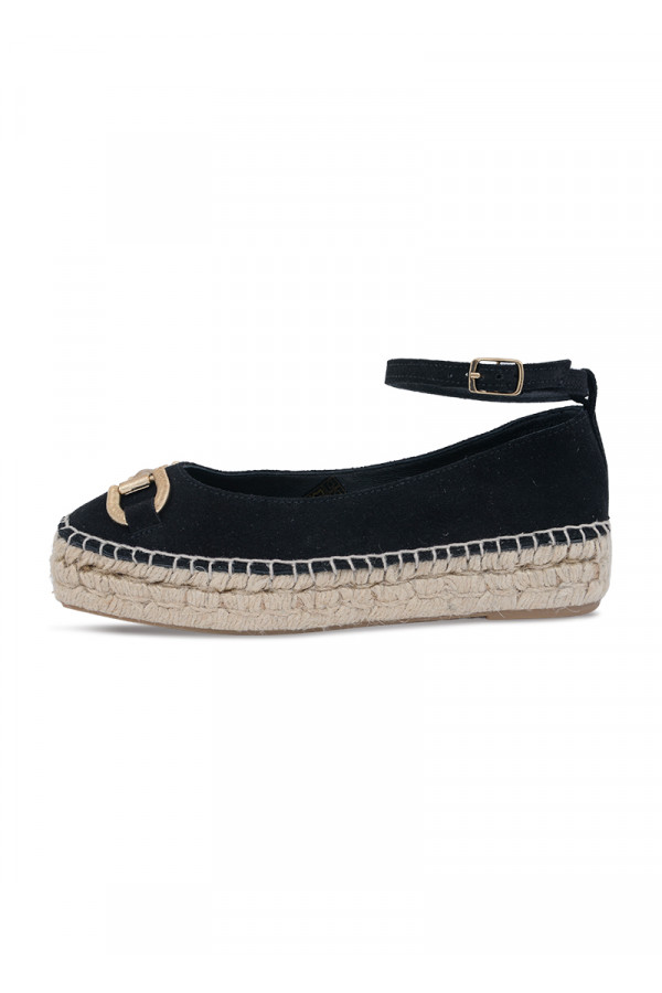 Opis: Kožne ženske espadrile u crnoj boji sa metalik zlatnim detaljem i kaišem