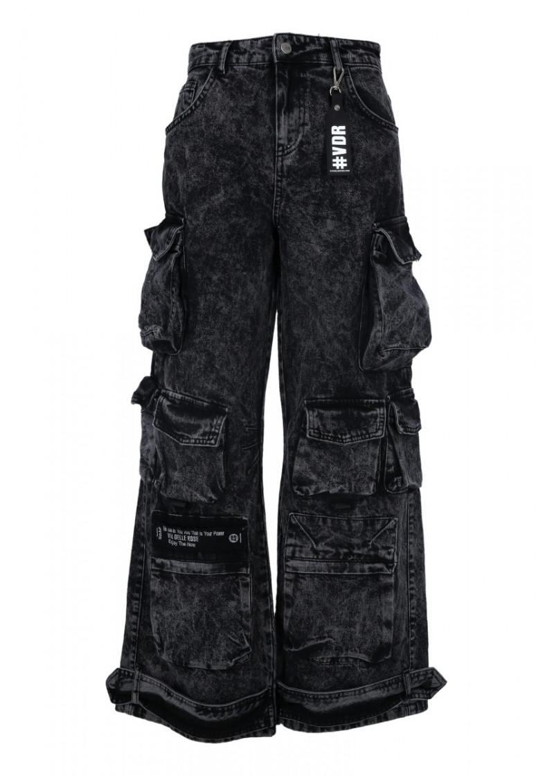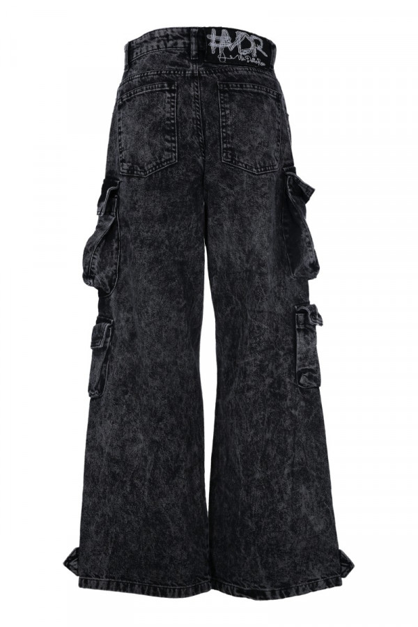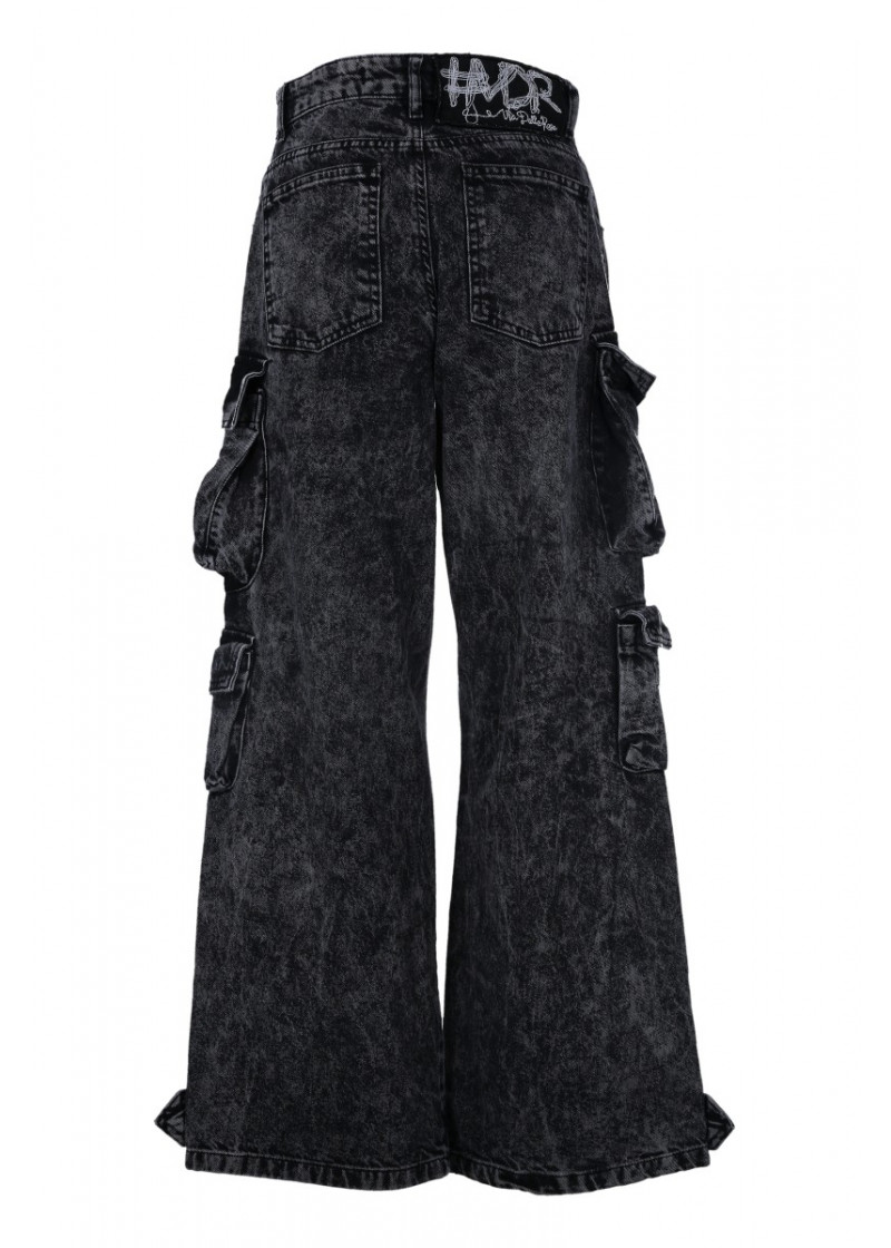 Opis: Ženske farmerke blago ispranoj crnoj boji sa visokim strukom, trapezastim nogavicama i našivenim džepovima