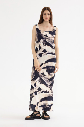 Opis: Duga haljina od prirodnog materijala u šarenom printu sa bočnim izrezom i brendiranim trakama na leđima