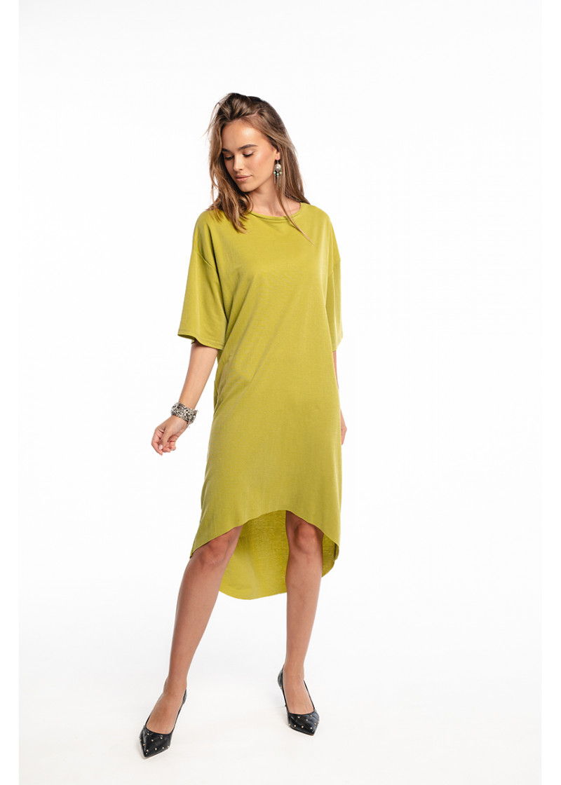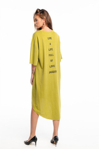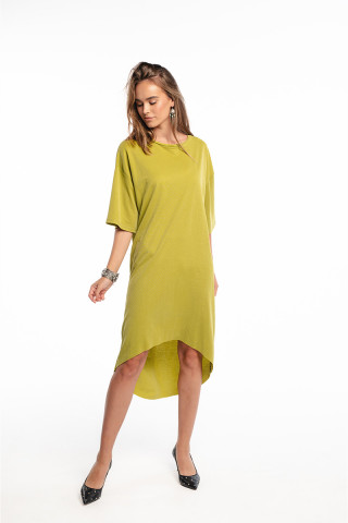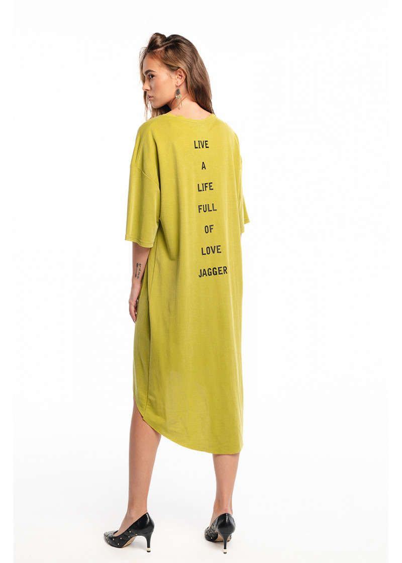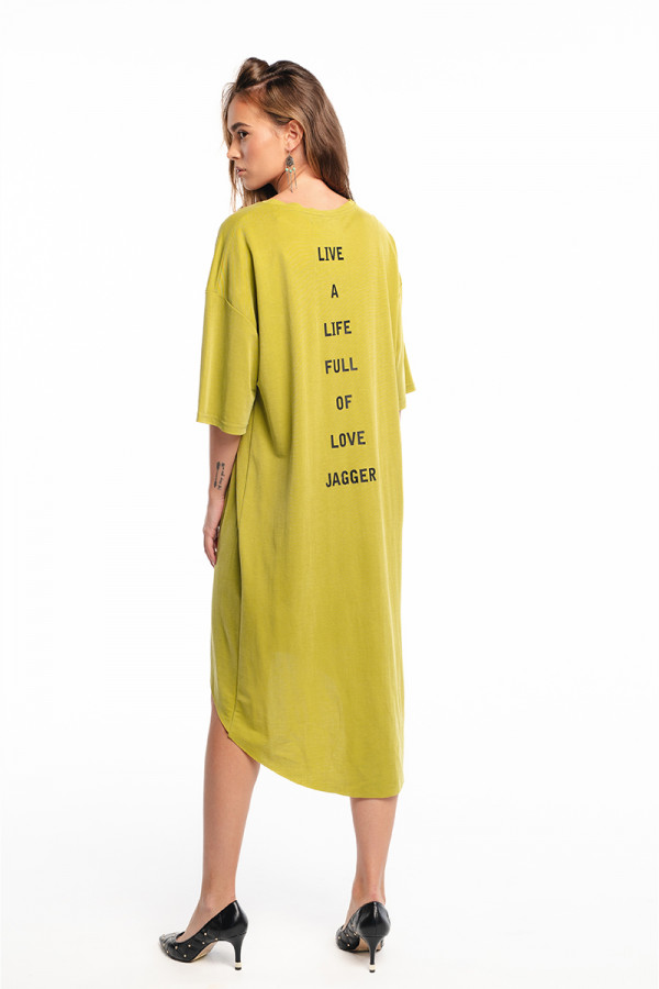 Opis: Haljina asimetričnog kroja u kivi zelenoj boji sa okruglim izrezom, kratkim rukavima i printom na leđima