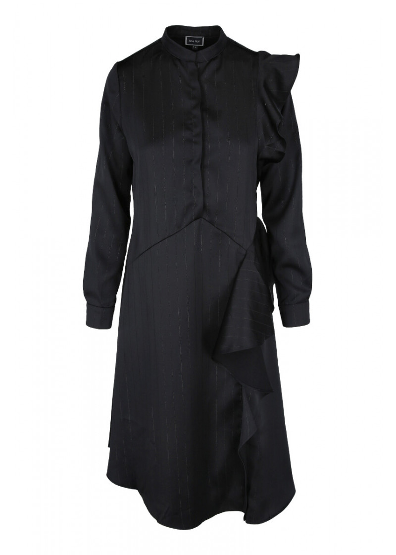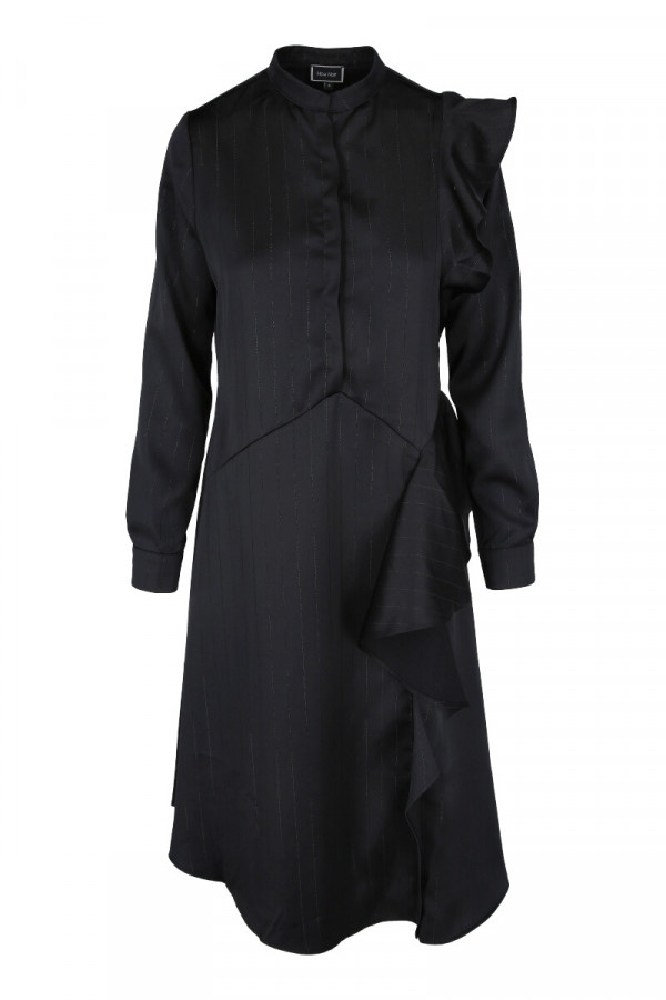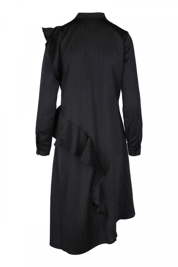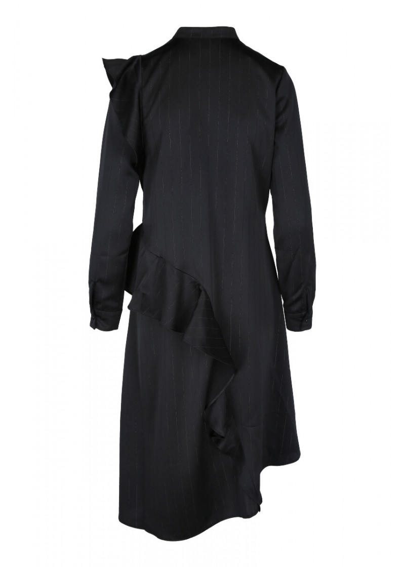 Opis: Haljina u crnoj boji, sa dugim rukavima i asimetričnim karnerom, protkana zlatnim lameom