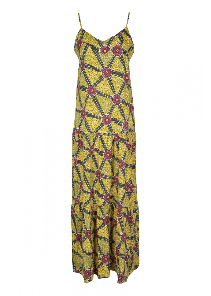 Opis: Duga haljina sa bretelama i karnerima u šarenom dezenu