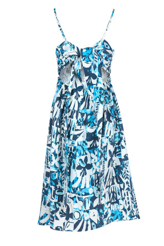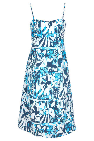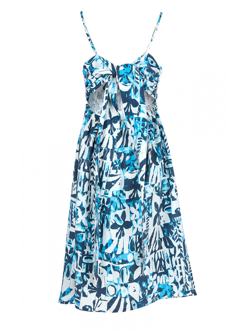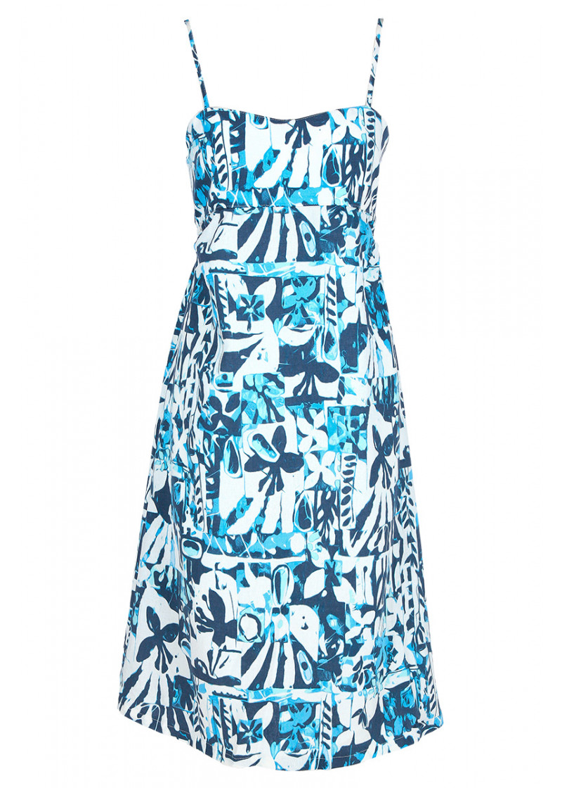 Opis: Haljina bez rukava u plavoj boji sa blago naglašenim strukom, nabrana na zadnjem delu