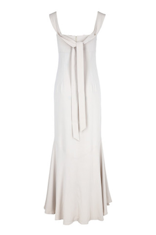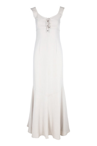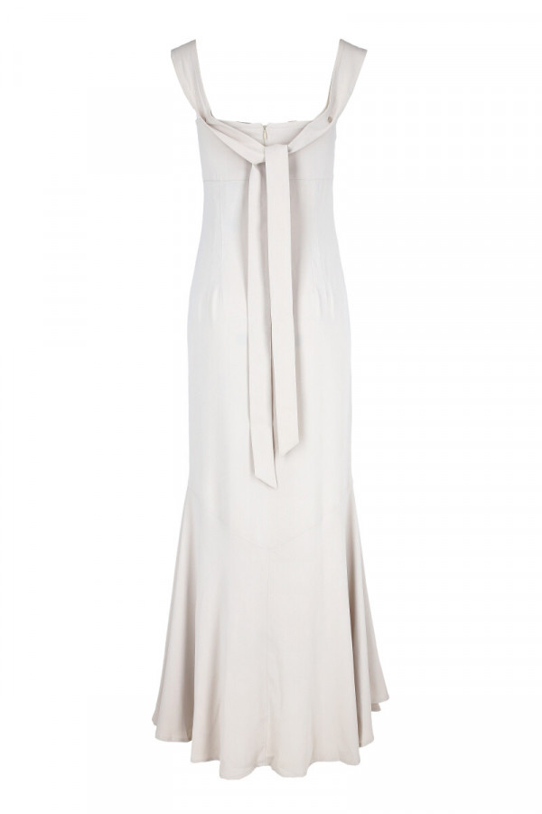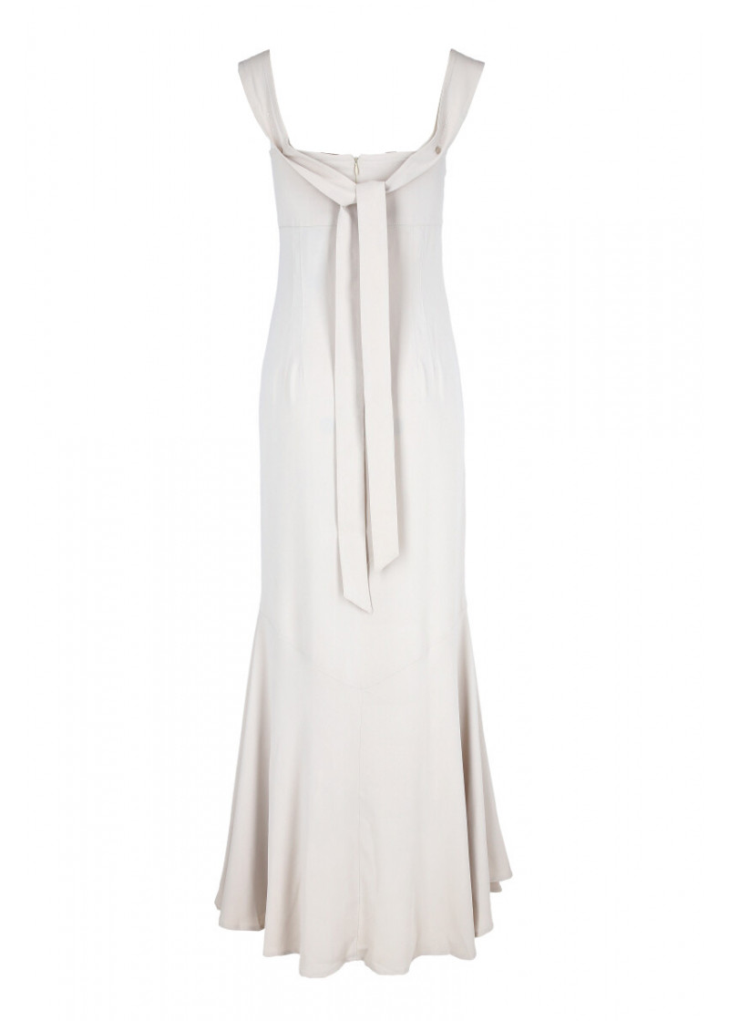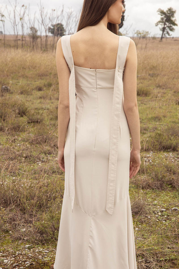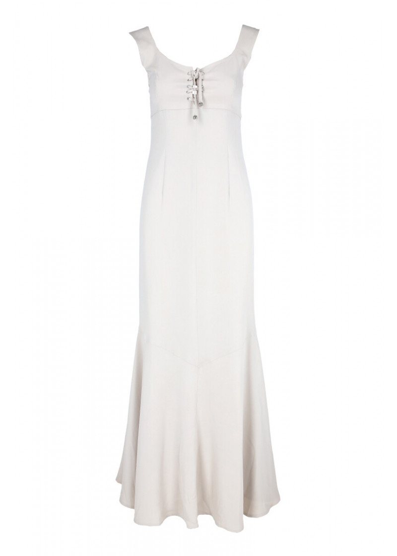Opis: Duga haljina bez rukava u boji vanile sa pertlanjem na prednjim delu i kaišem na leđima