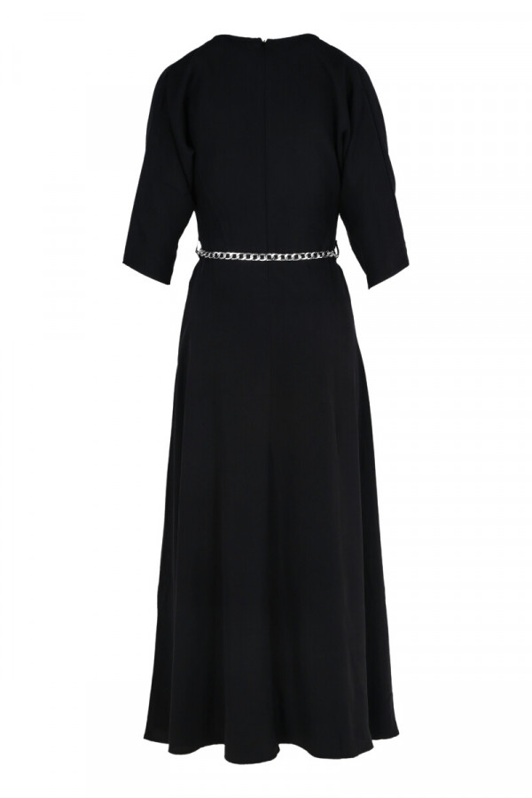 Opis: Duga haljina u crnoj boji sa Ve izrezom, naglašenim strukom i srebrnim lanac kaišem
