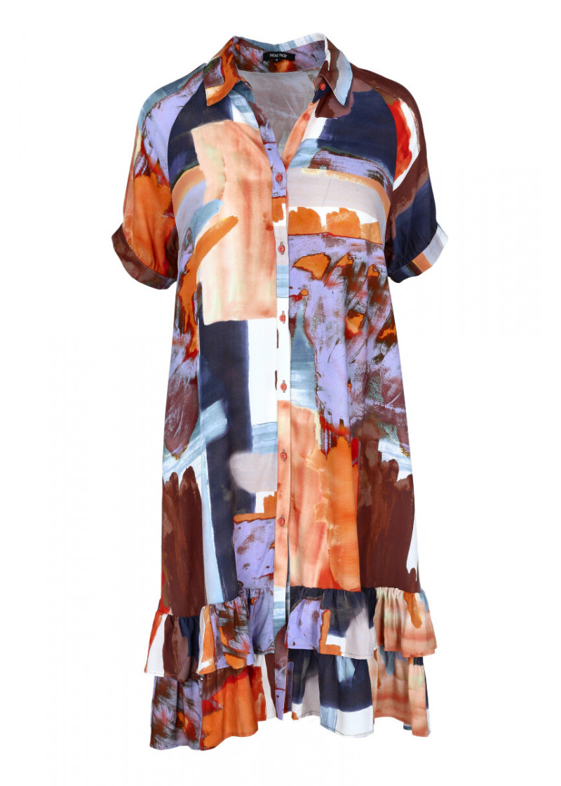 Opis: Viskozna košulja-haljina u šarenom dezenu sa kratkim rukavima i karnerima