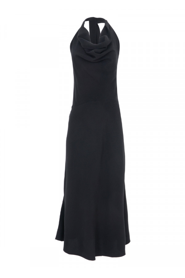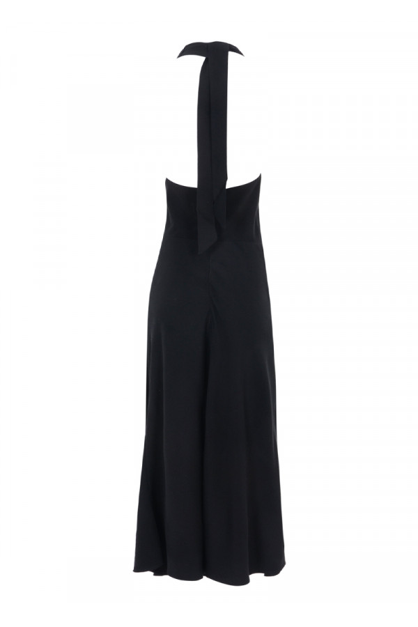 Opis: Duga haljina u crnoj boji sa nabranim okovratnikom, trakom koja se vezuje oko vrata i otvorenim leđima
