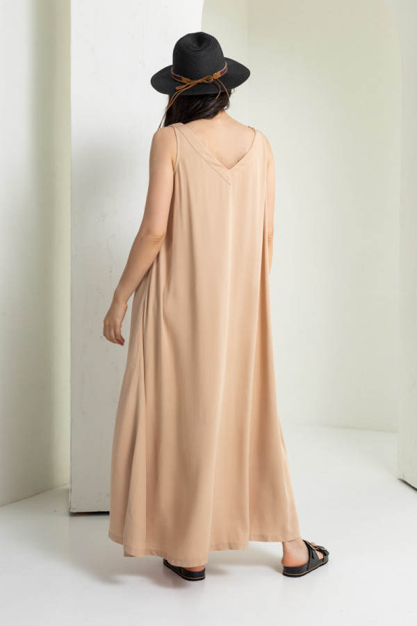 Opis: Duga ženska haljina širokog kroja u bež boji bez rukava sa V-e izrezom na leđima