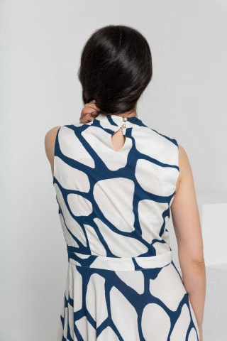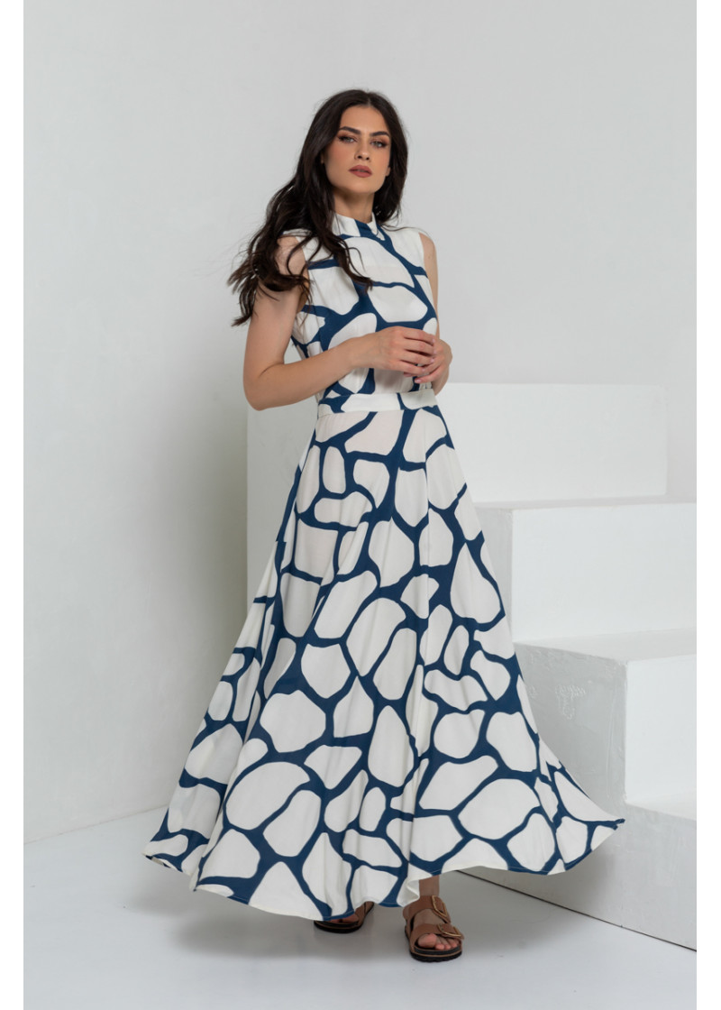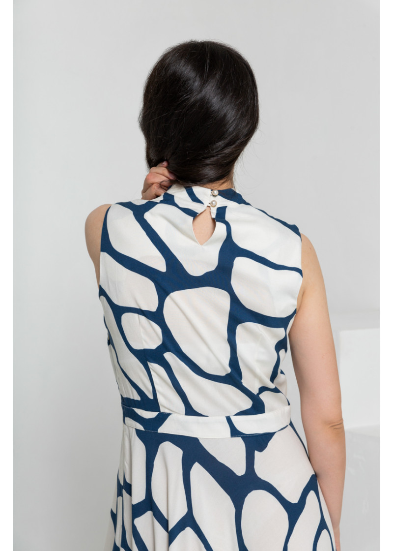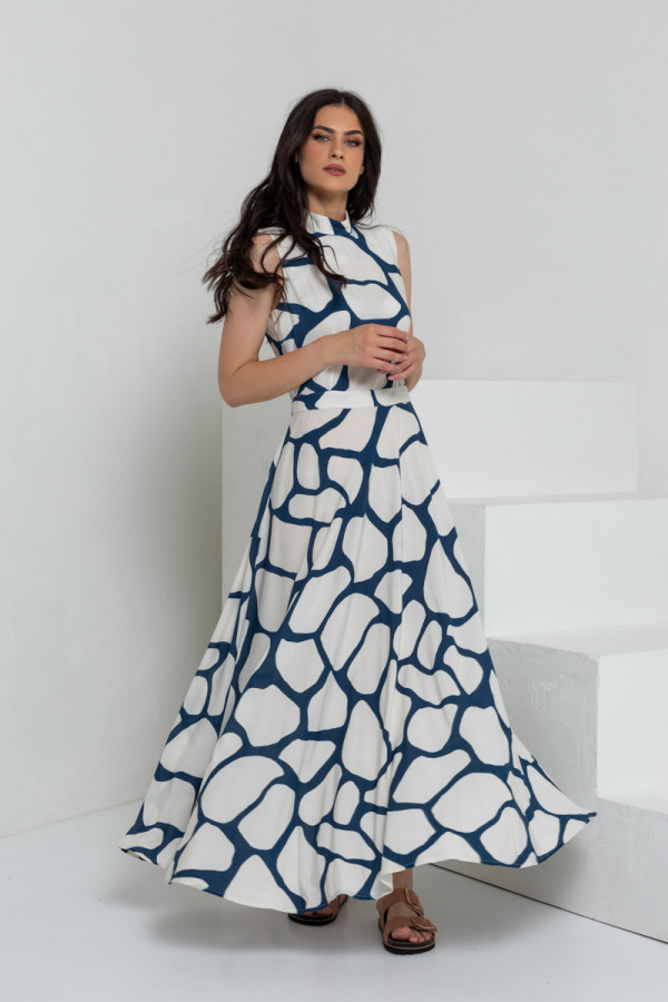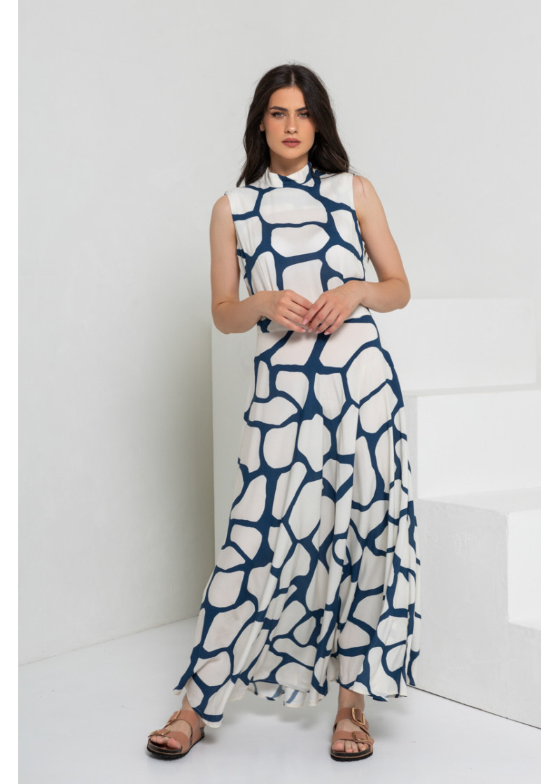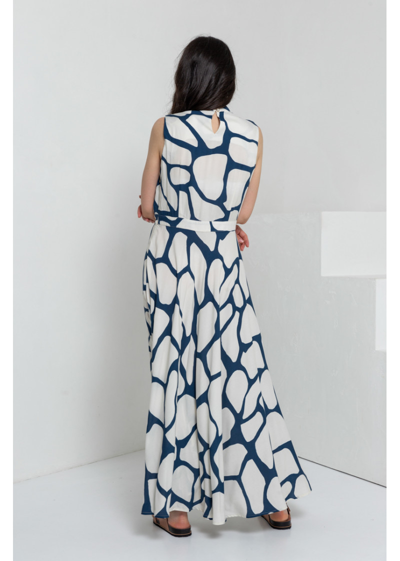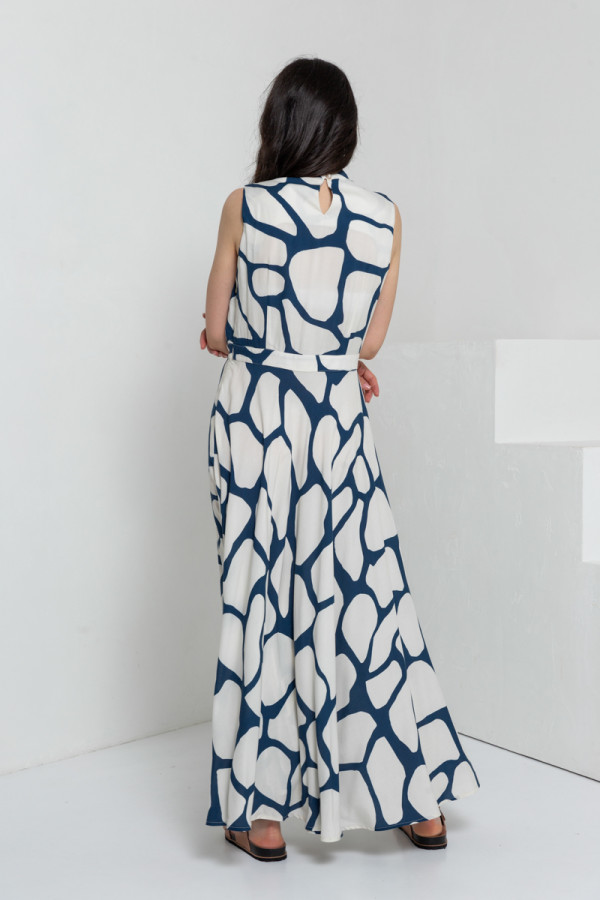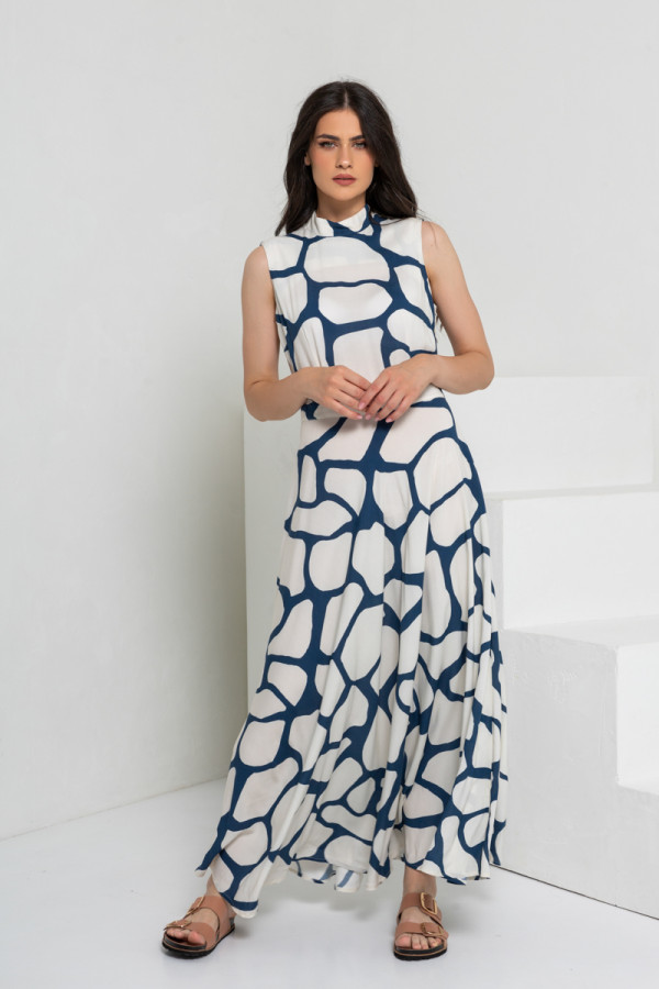 Opis: Duga haljina u teget-belom žirafa printu bez rukava sa širokim faltama i polurol kragnom