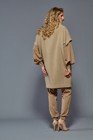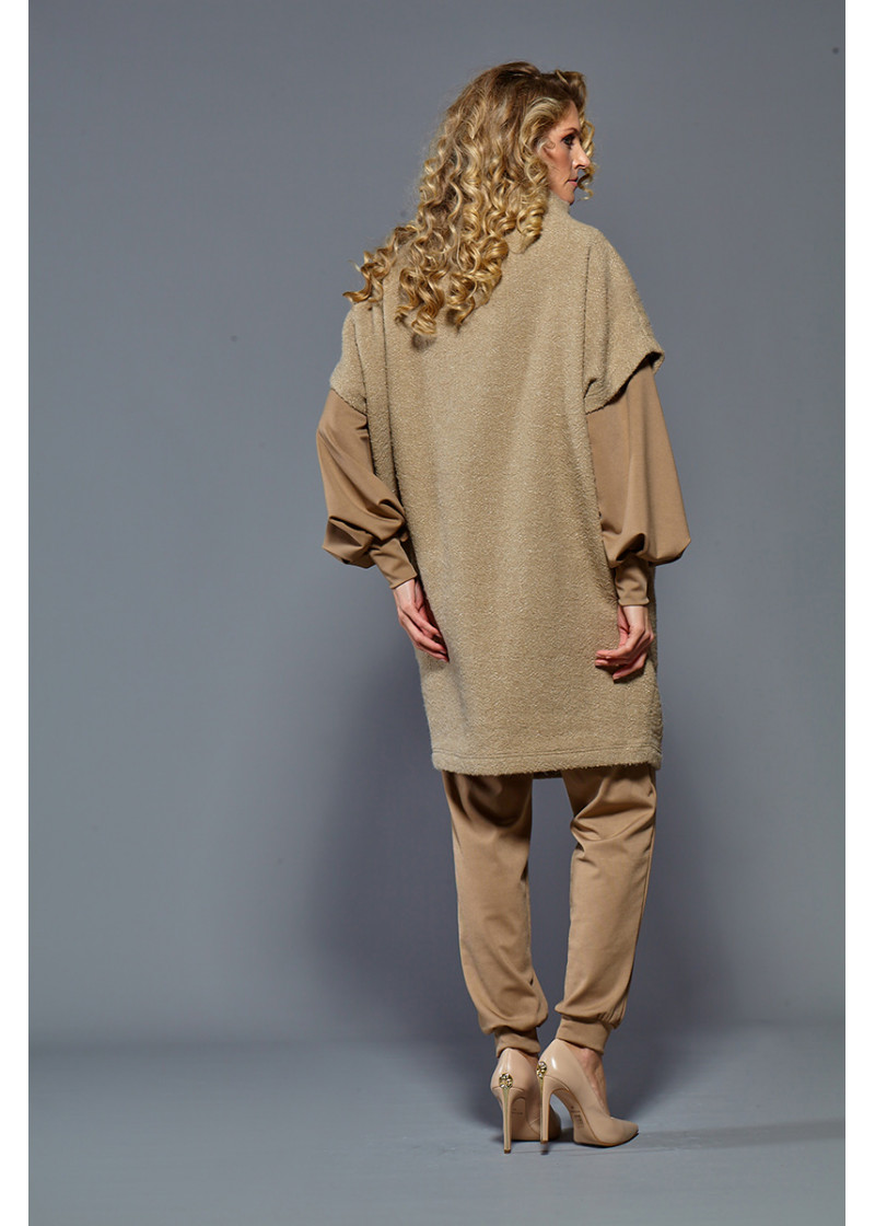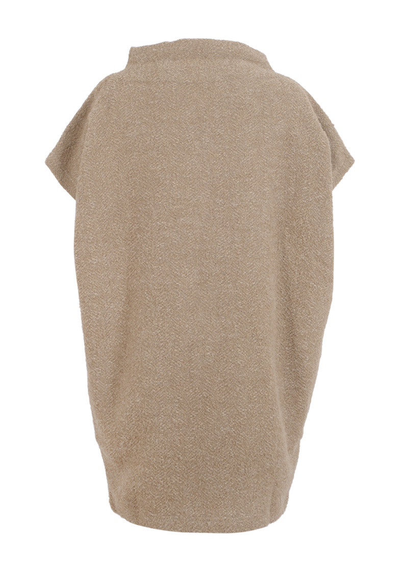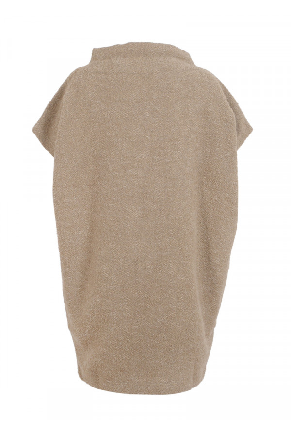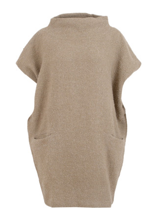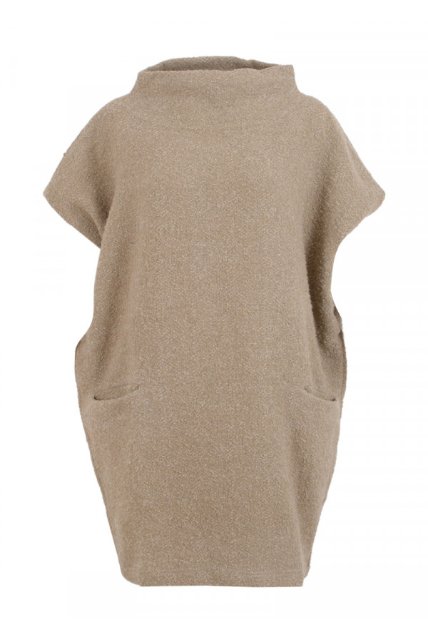 Opis: Tunika-haljina ležernog kroja u bež boji sa džepovima i visokom polurol kragnom