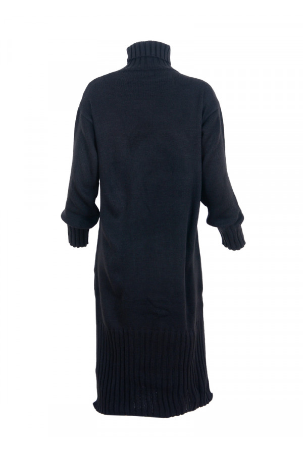 Opis: Duga haljina u crnoj boji sa logo printom, rol kragnom i bočnim šlicem