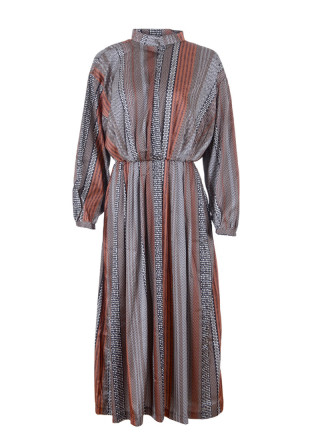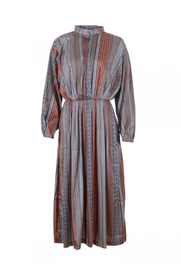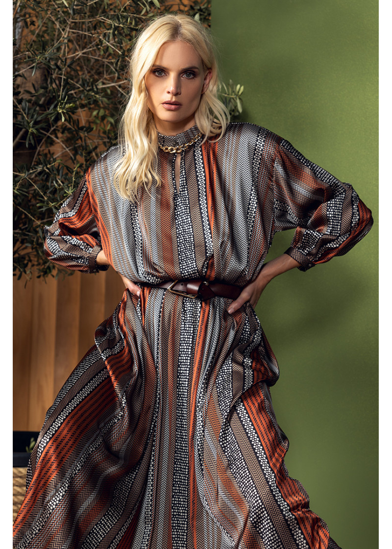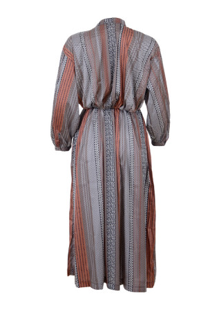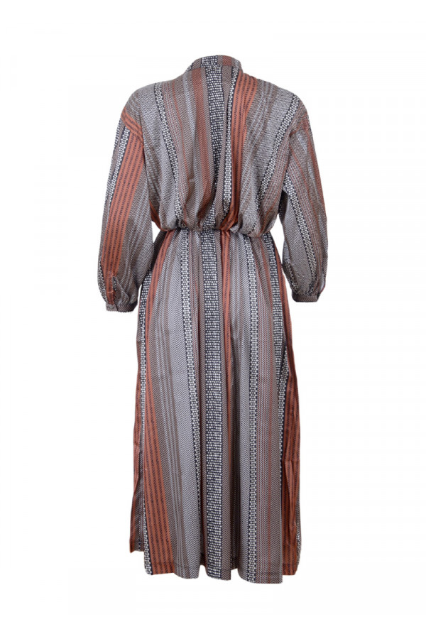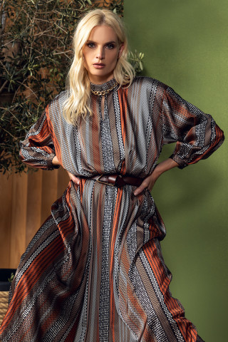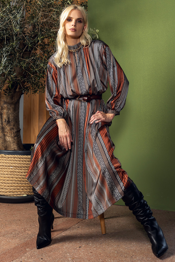 Opis: Duga haljina u multi color prugastom dezenu sa nabranim pojasom