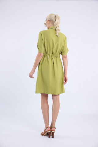 Opis: Haljina-košulja od viskoze u boji limete sa kratkim rukavima i lastiš pojasom u struku