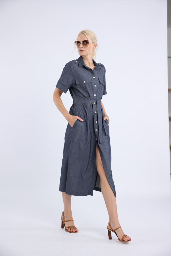 Opis: Midi košulja-haljina u denim boji sa kratkim rukavima i kaišem