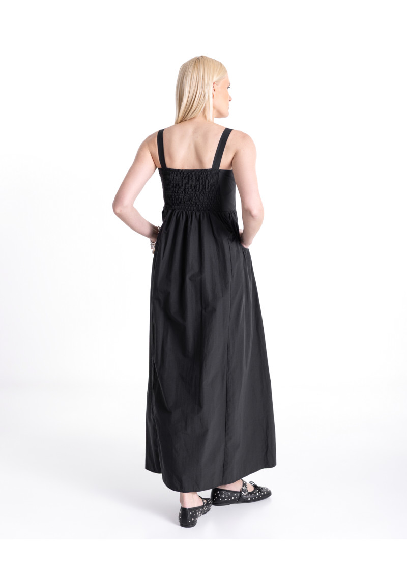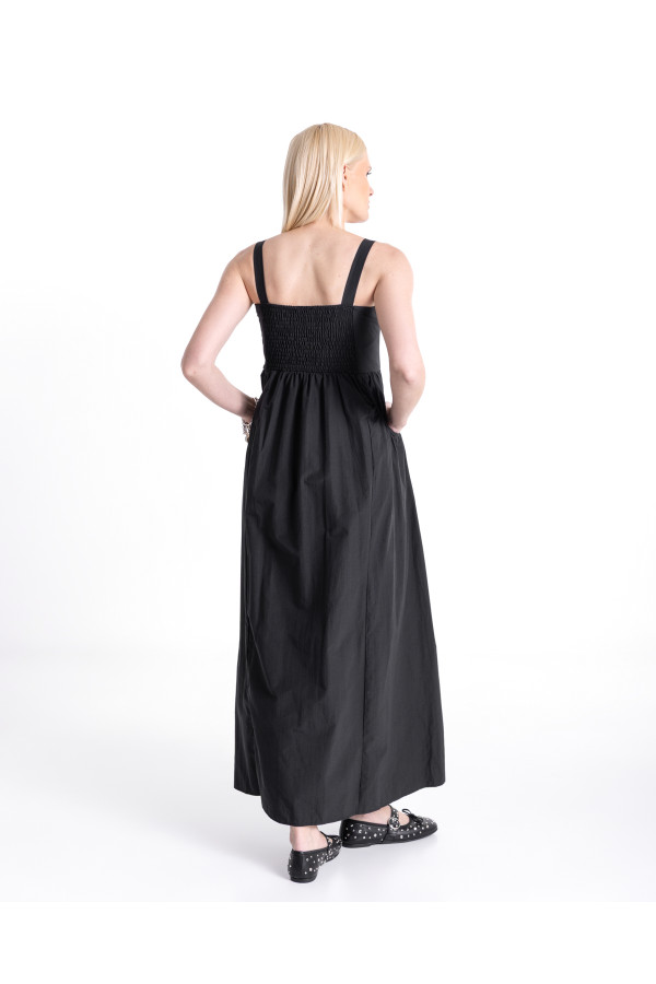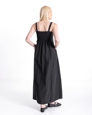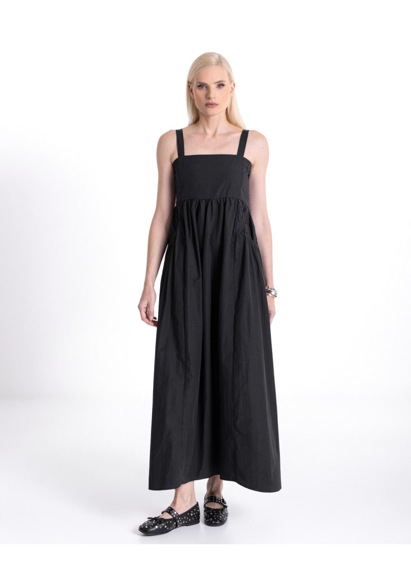 Opis: Duga haljina u crnoj boji sa bretelama i bočnim džepovima