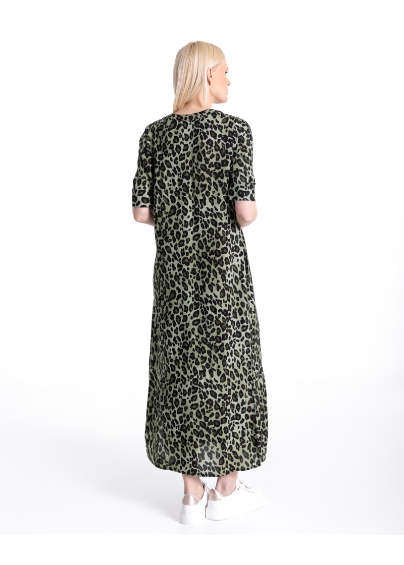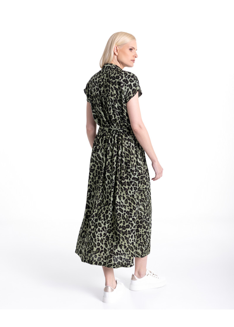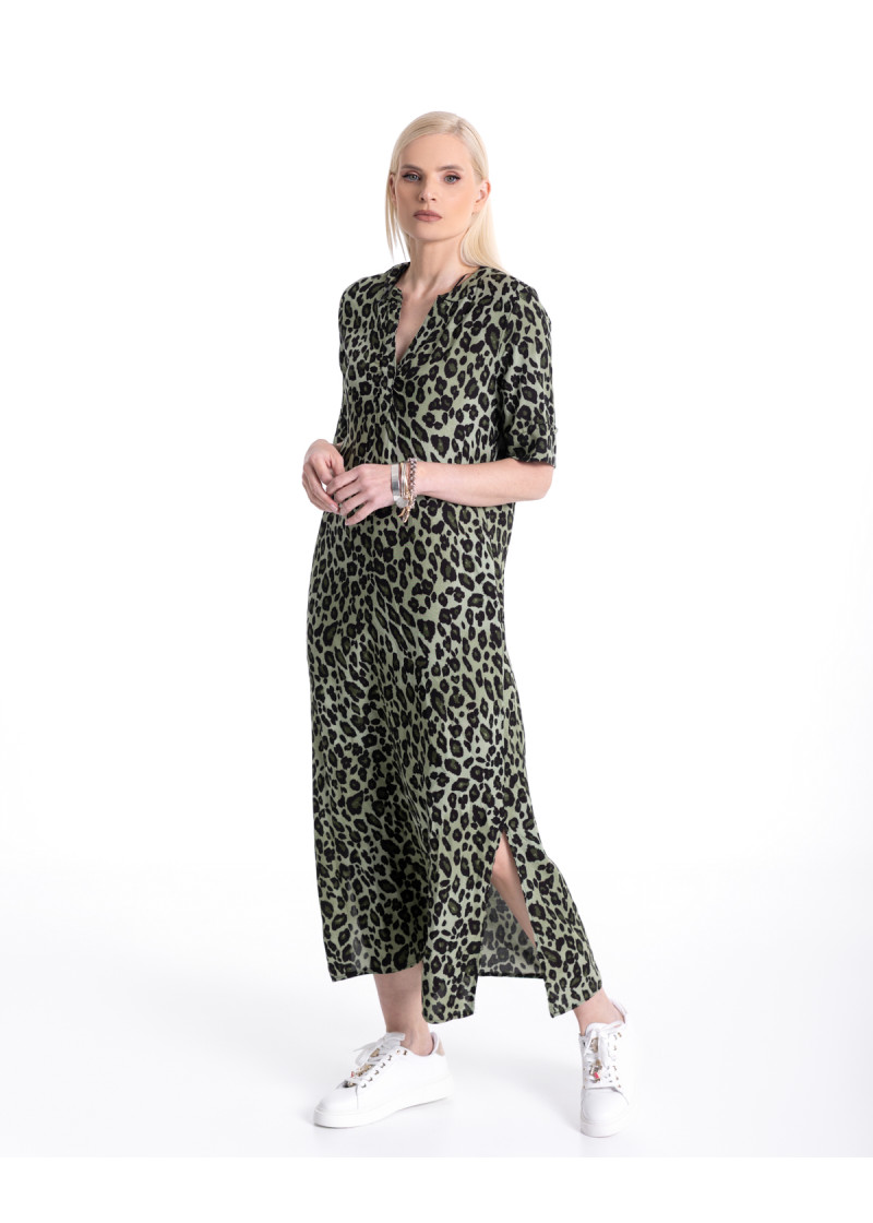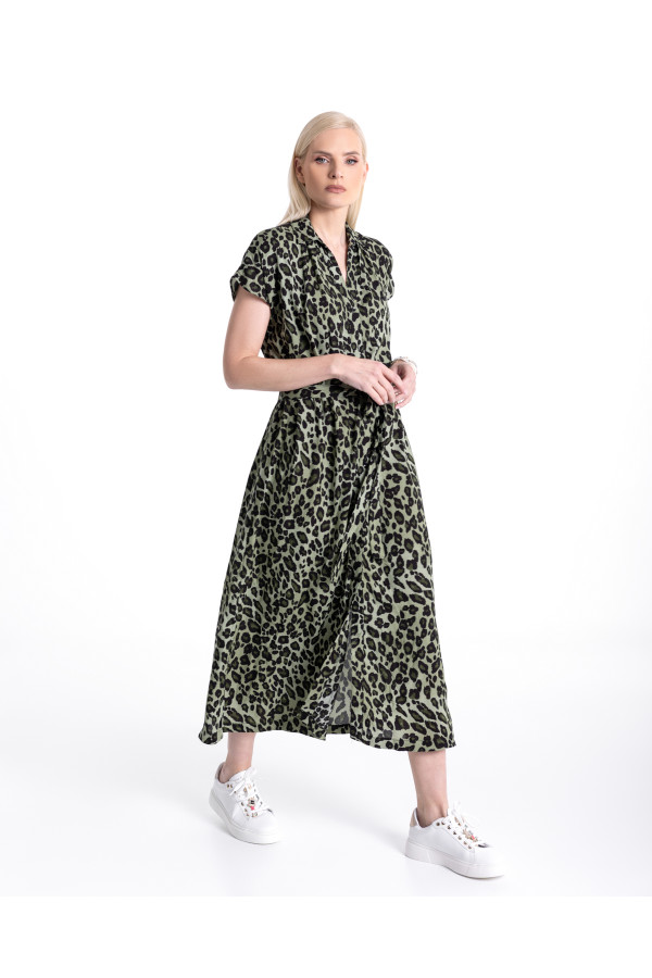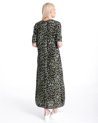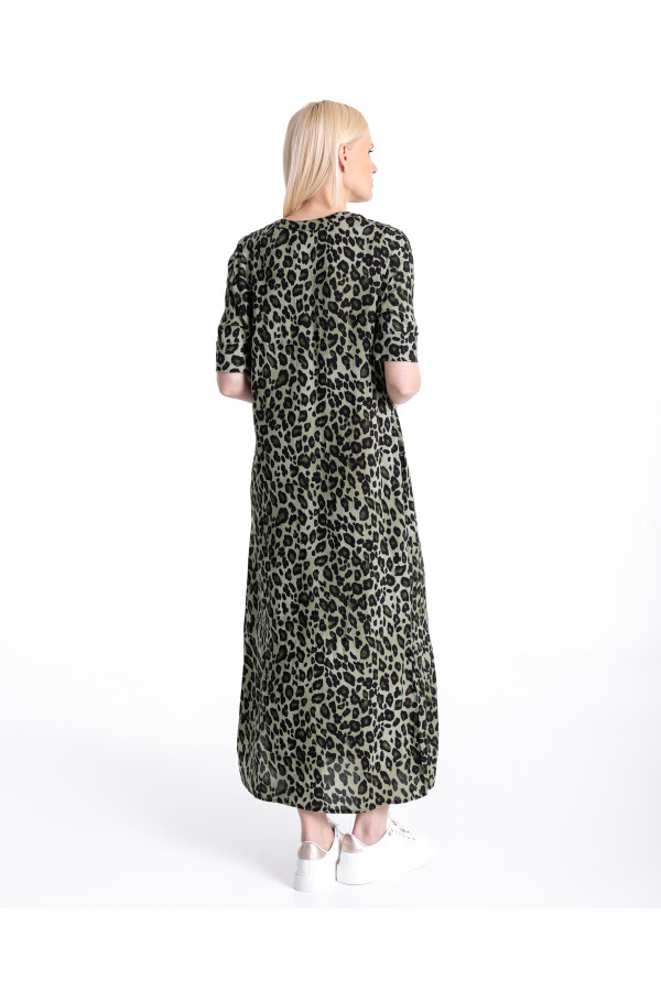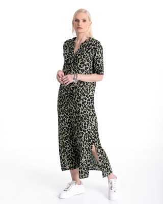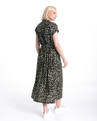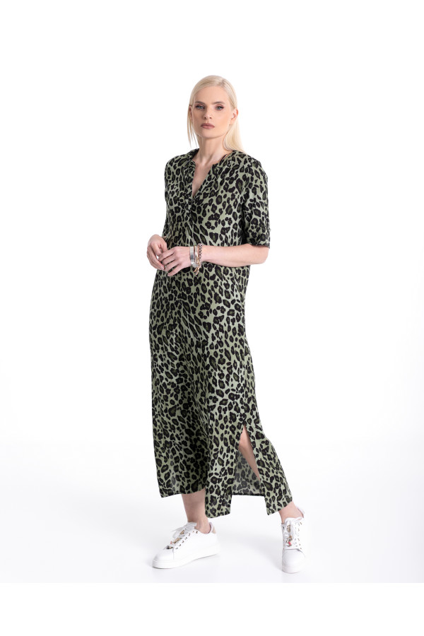 Opis: Haljina od viskoze u animal printu sa podesivom dužinom rukava i bočnim šlicevima