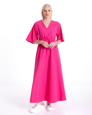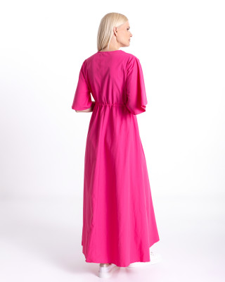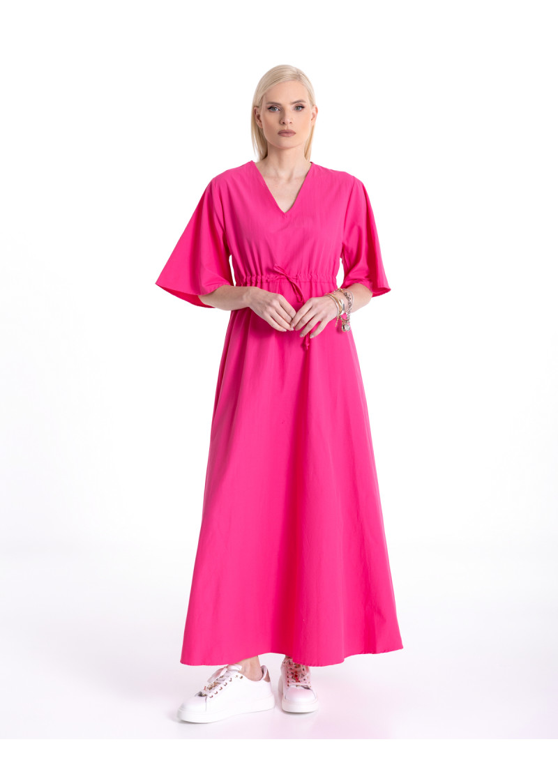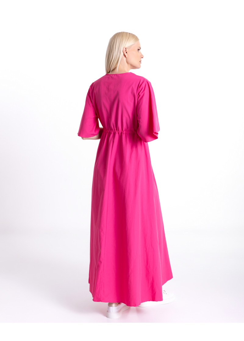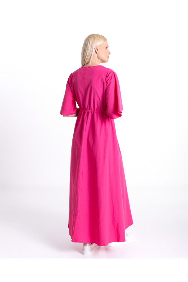 Opis: Duga haljina u pink boji sa 3/4 rukavima, V-e izrezom i učkurom u struku