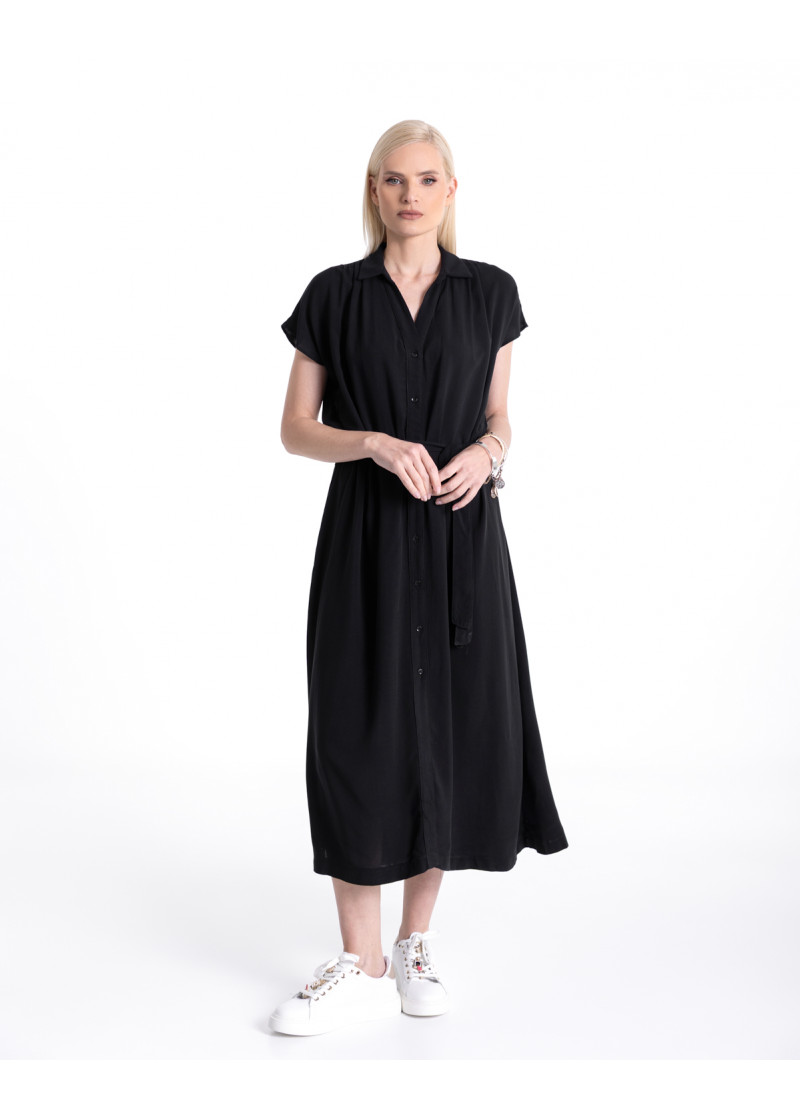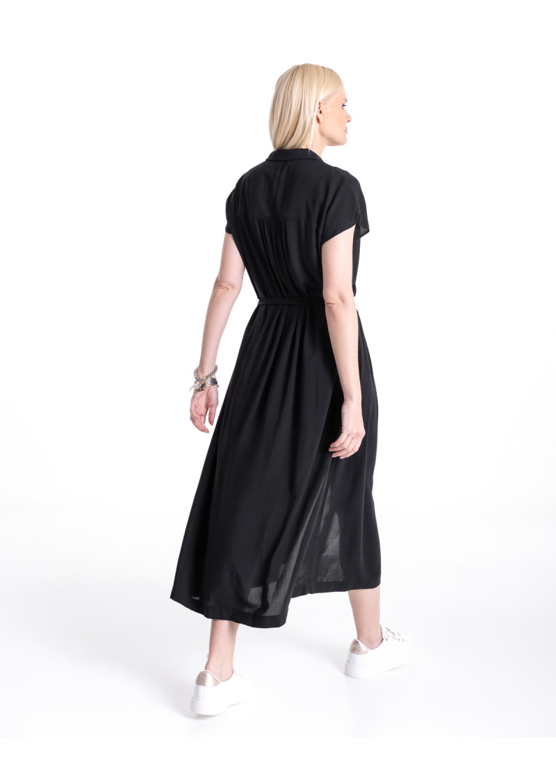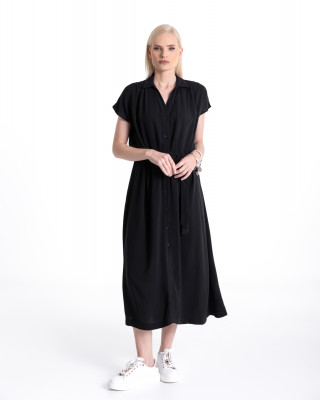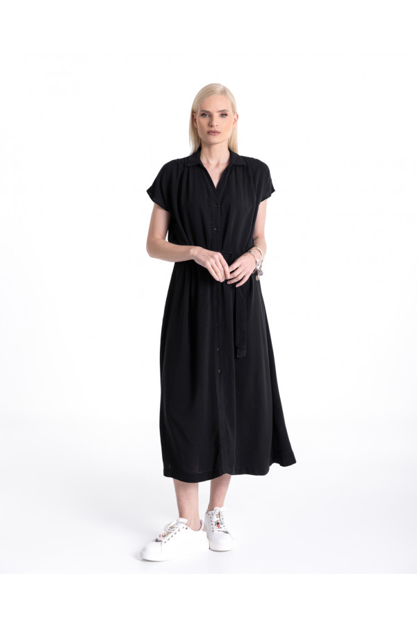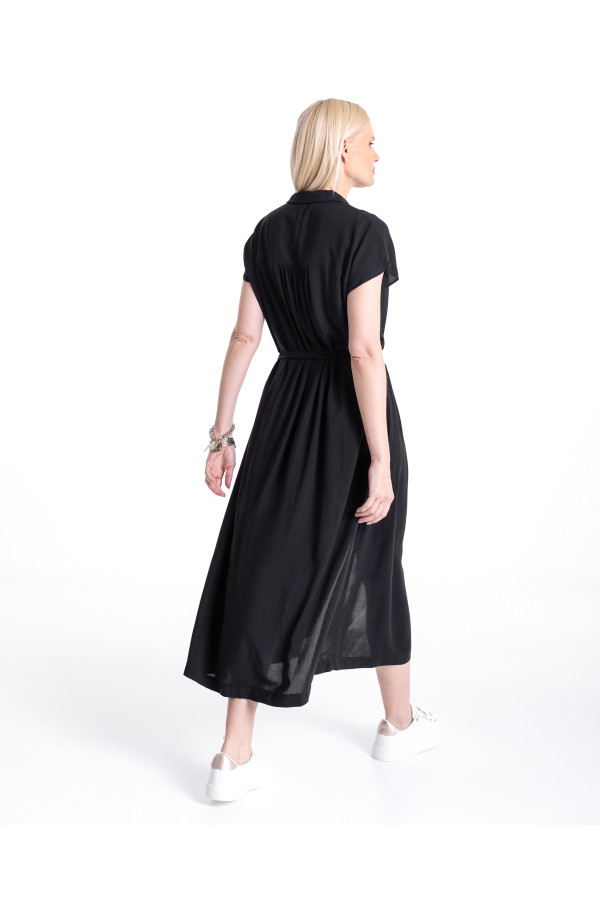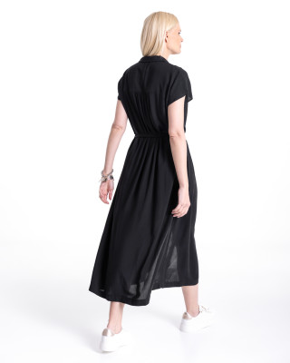 Opis: Duga haljina od viskoze u crnoj boji sa krtakim rukavima i dugmićima