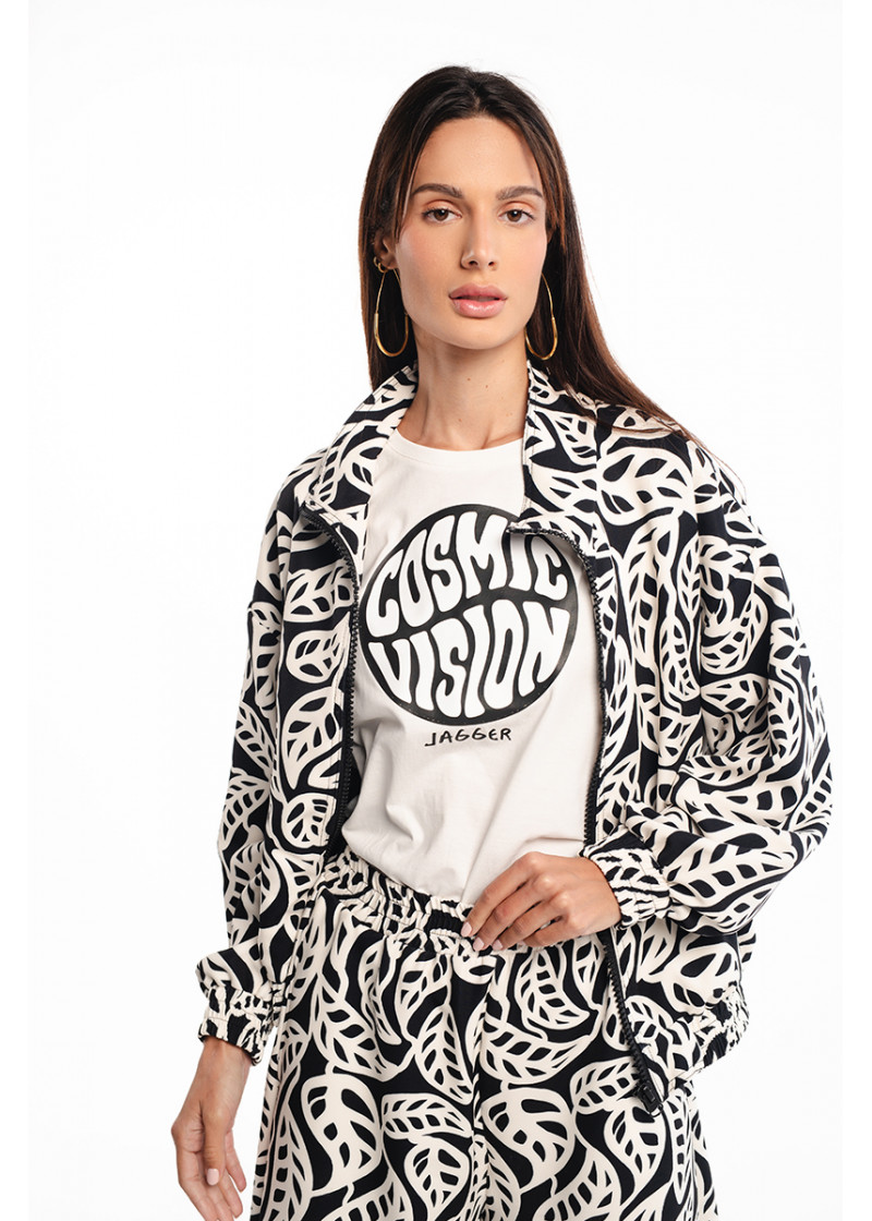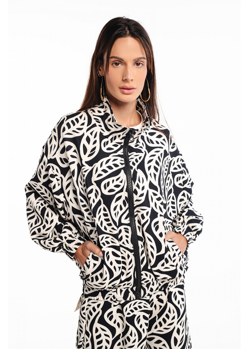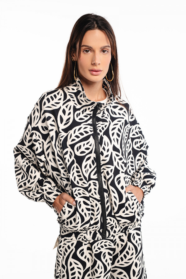 Opis: Ženska jakna u cvetnom dezenu sa zipom i aplikacijom na leđima