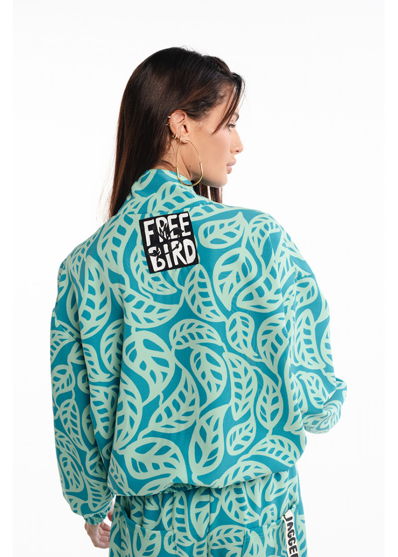 Opis: Ženska jakna u cvetnom dezenu sa zipom i aplikacijom na leđima