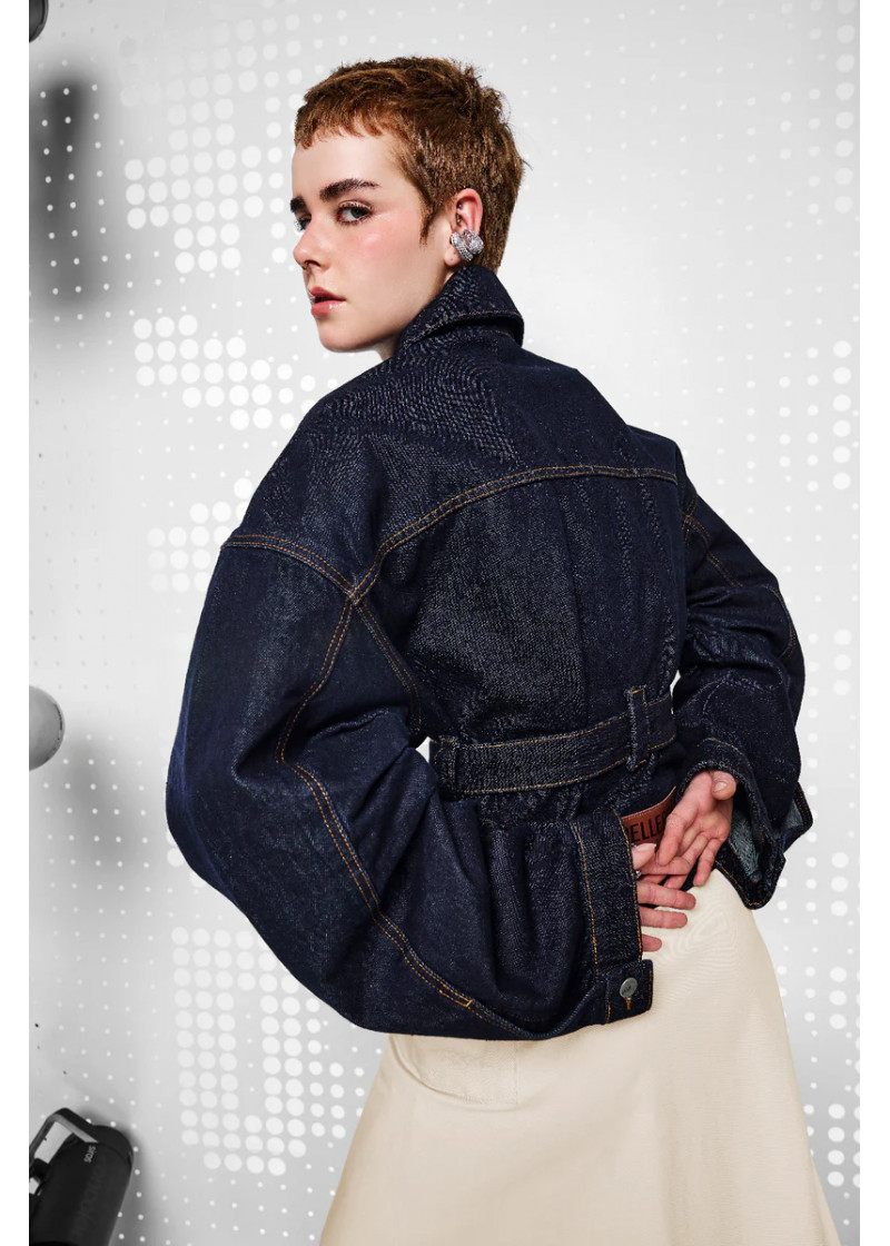 Opis: Ženska jakna od teksasa u teget boji sa oversized rukavima, prednjim džepovimai kaišem