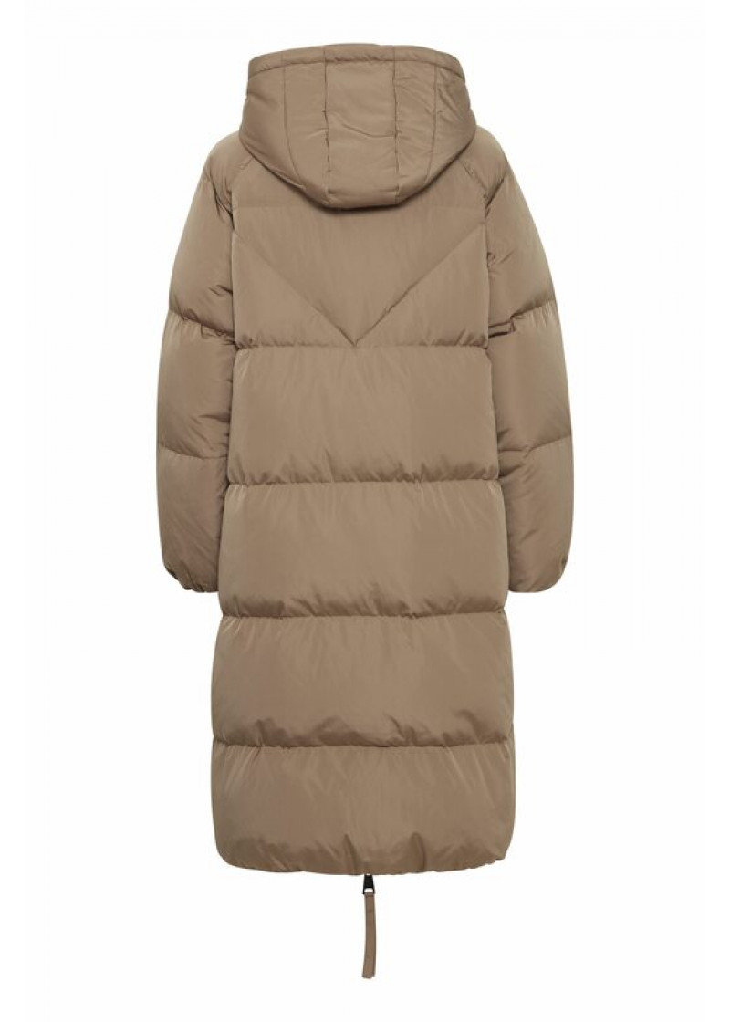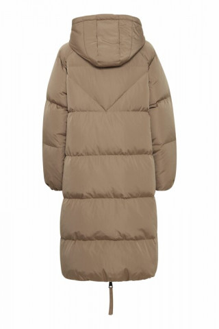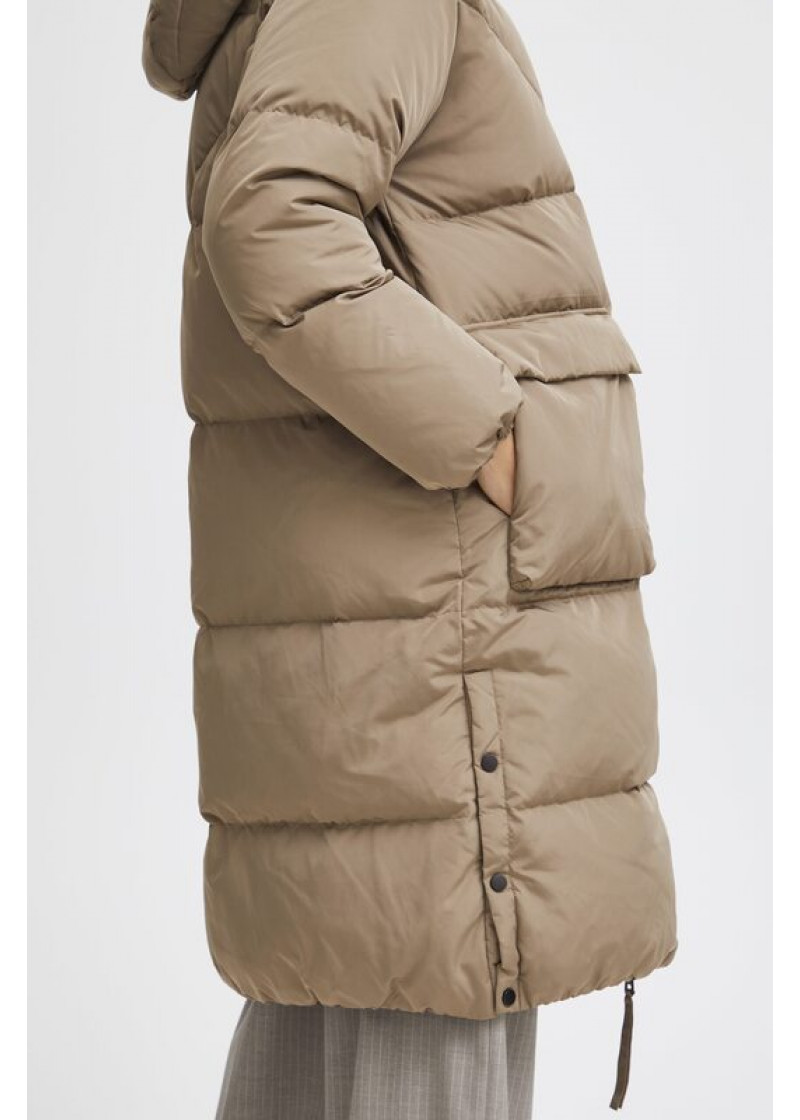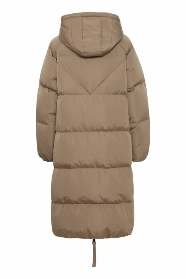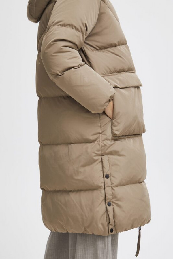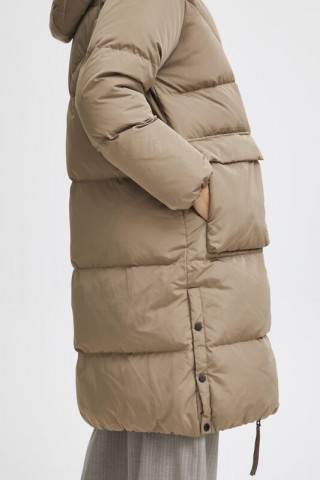Opis: Dugačka štepana ženska jakna u bež boji sa zipom, prednjim džepovima i kapuljačom