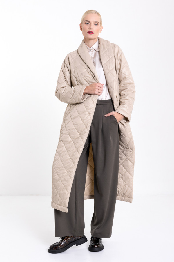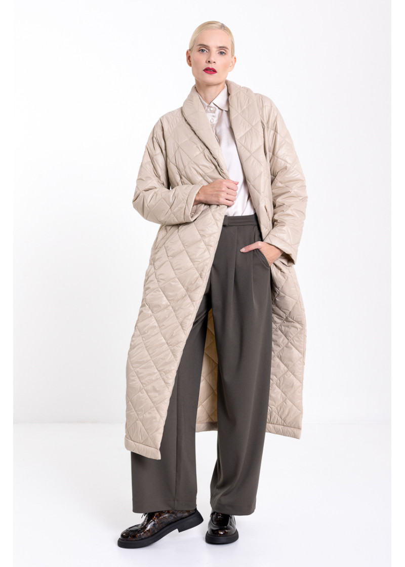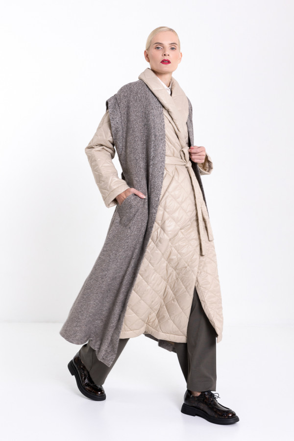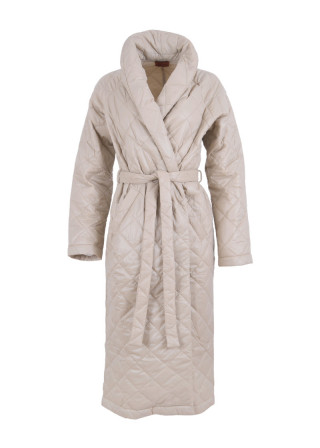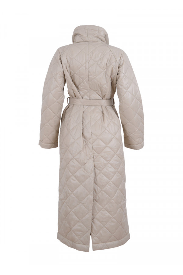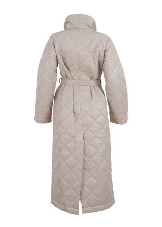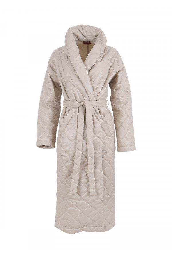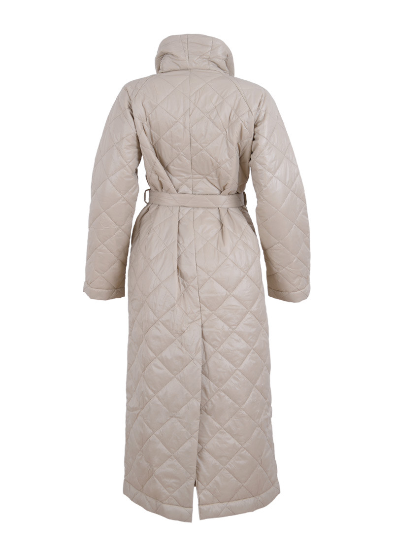 Opis: Duga ženska štepana jakna u vanila boji sa reverima i kaišem