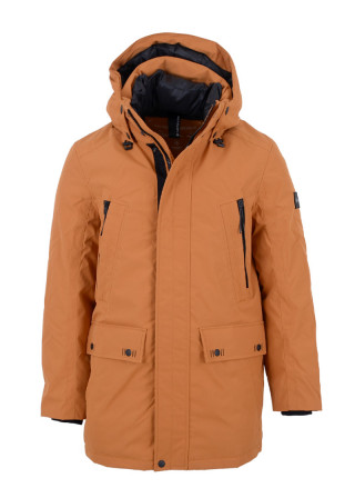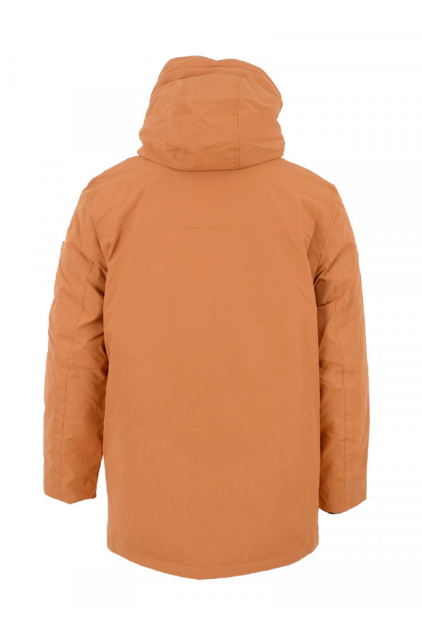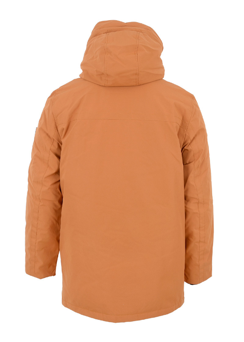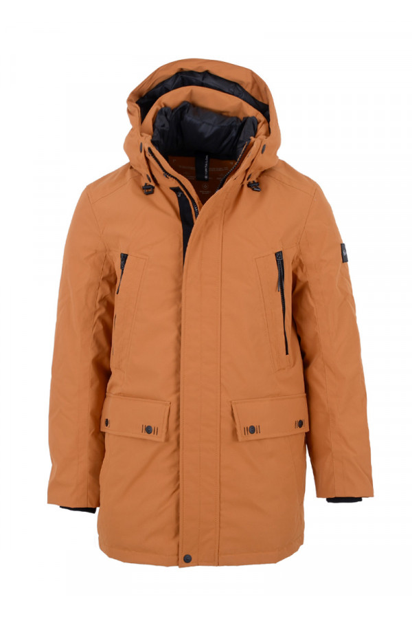 Opis: Duga muška jakna klasičnog kroja u narandžastoj boji sa skrivenim zipom i kapuljačom