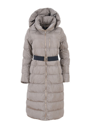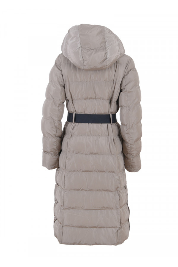 Opis: Duga ženska štepana jakna u bež boji sa zipom, lastiš pojasom i kapuljačon