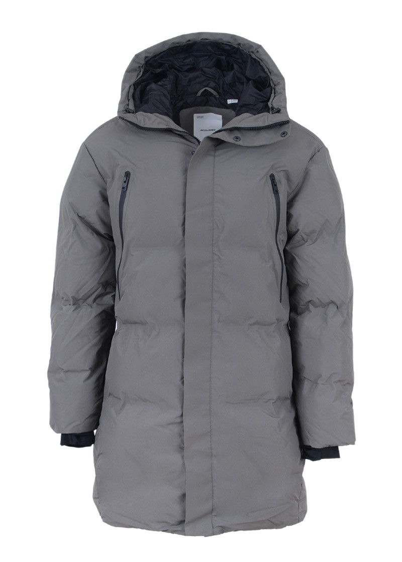 Opis: Duga nuška jakna u sivoj boji sa štepovima, zipom i kapuljačom