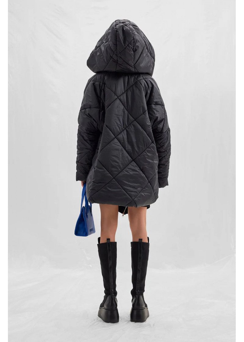 Opis: Ženska štepana jakna u crnoj boji sa zipovima i kapuljačom