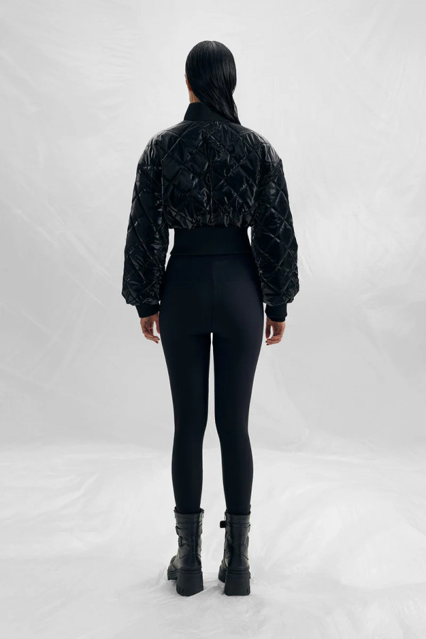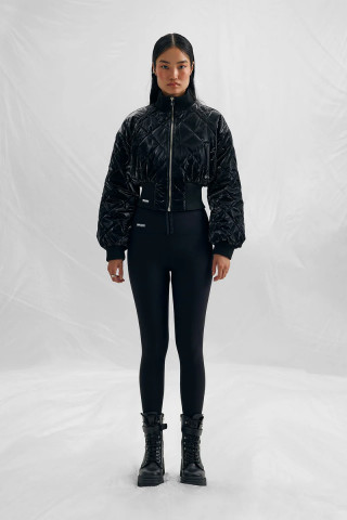 Opis: Ženska štepan abomber jakna u crnoj boji sa zipom i visokom kragnom