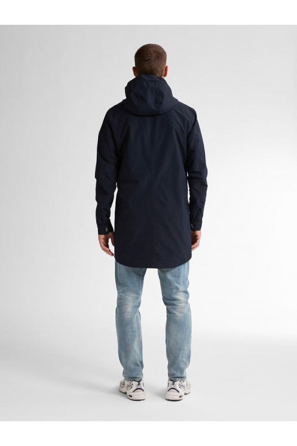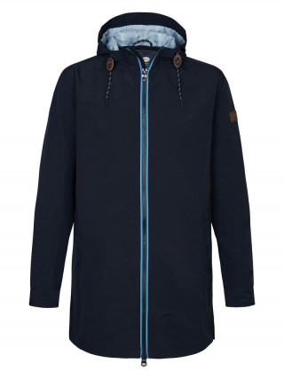 Opis: Duga muška jakna u teget boji sa zipom i kapuljačom