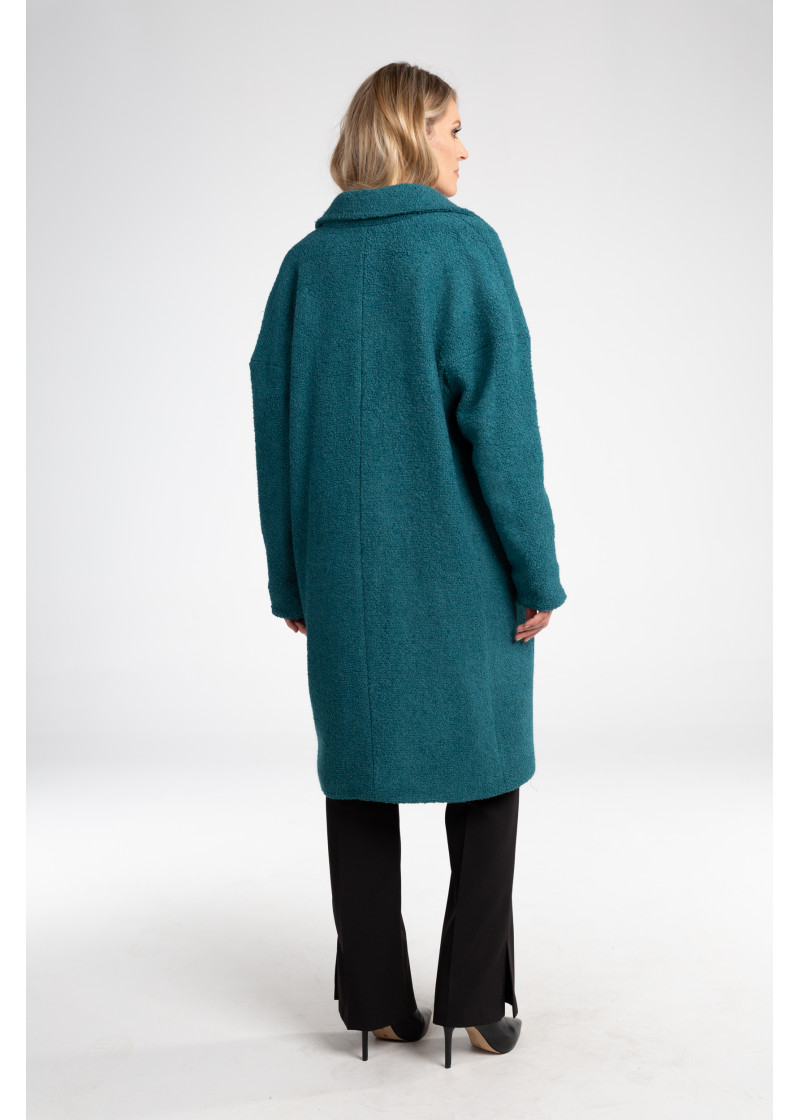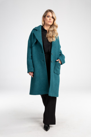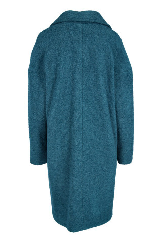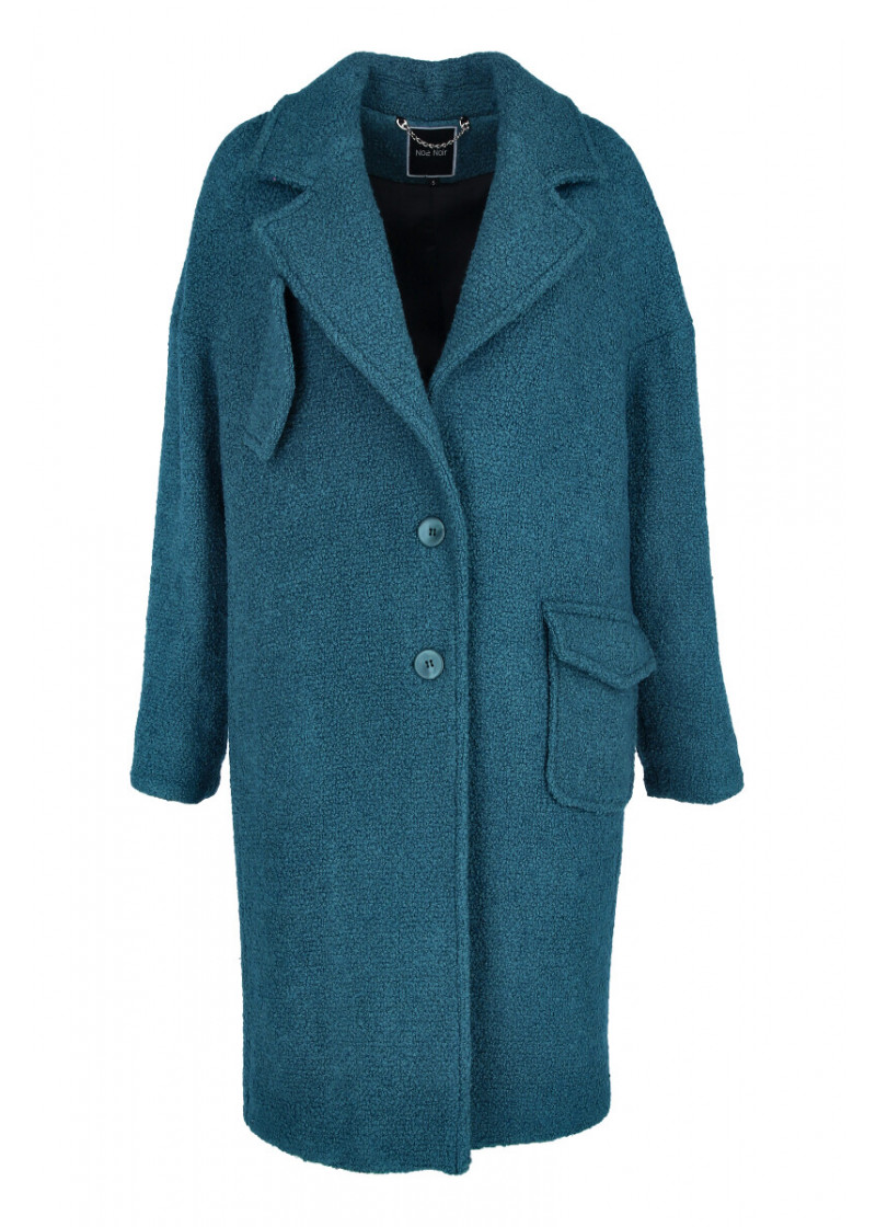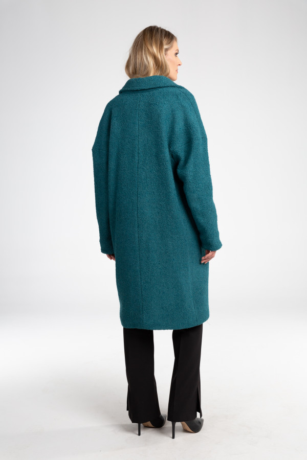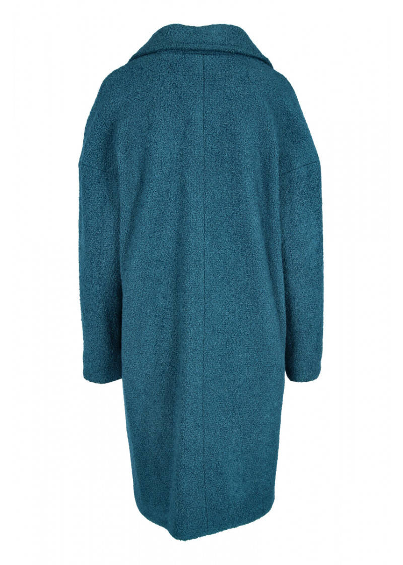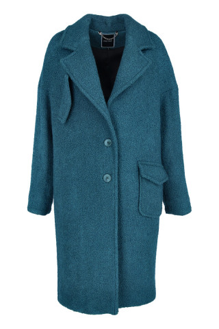 Opis: Ženski kaput u petrolej boji sa spuštenim naramenicama, reverima i džepom