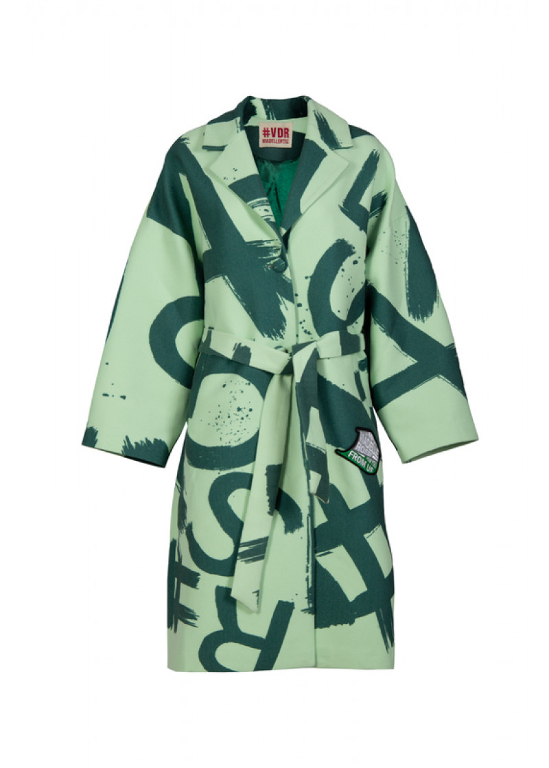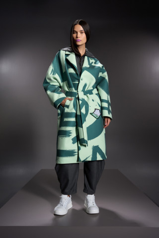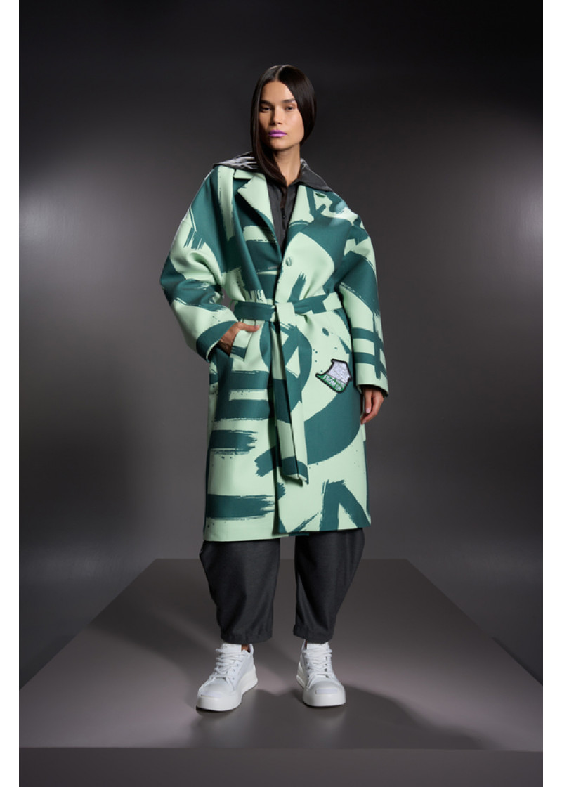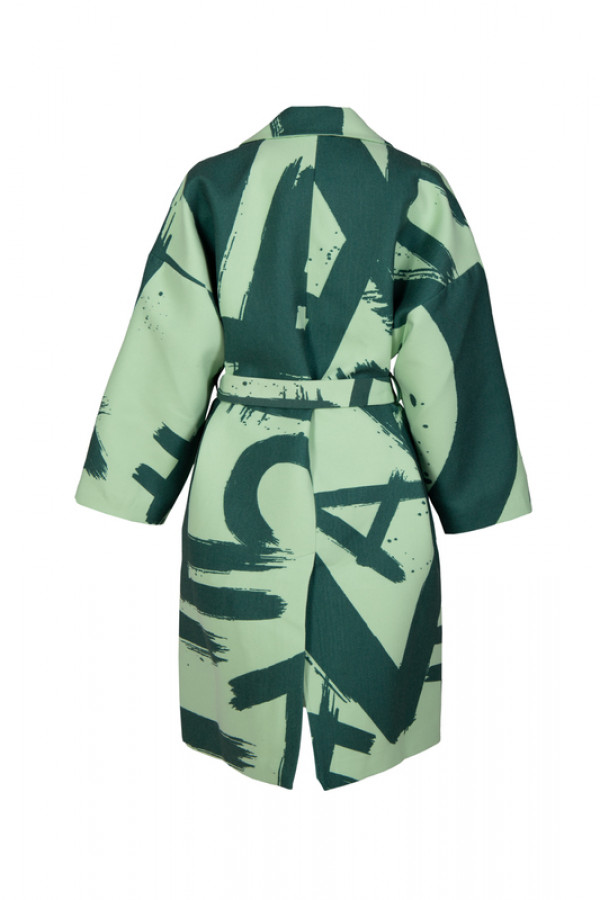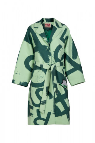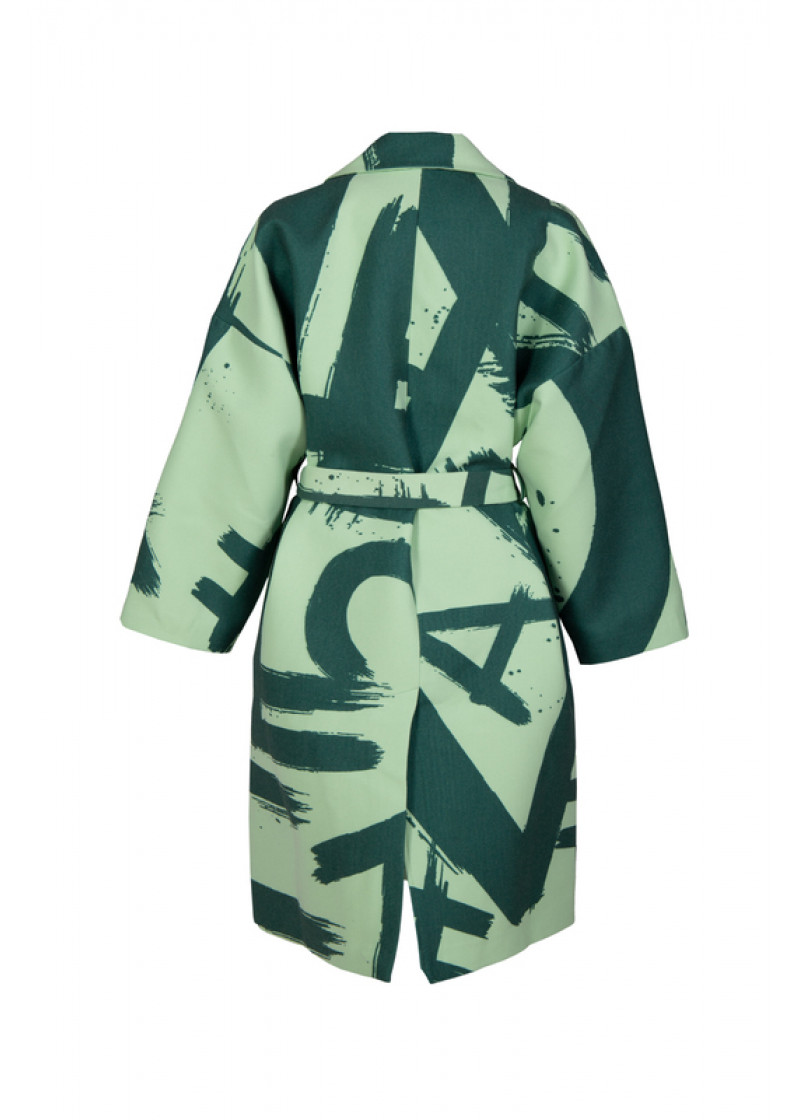 Opis: Dugačak ženski kaput u u zelenom all over logo printu sa kaišem i bočnim džepovima